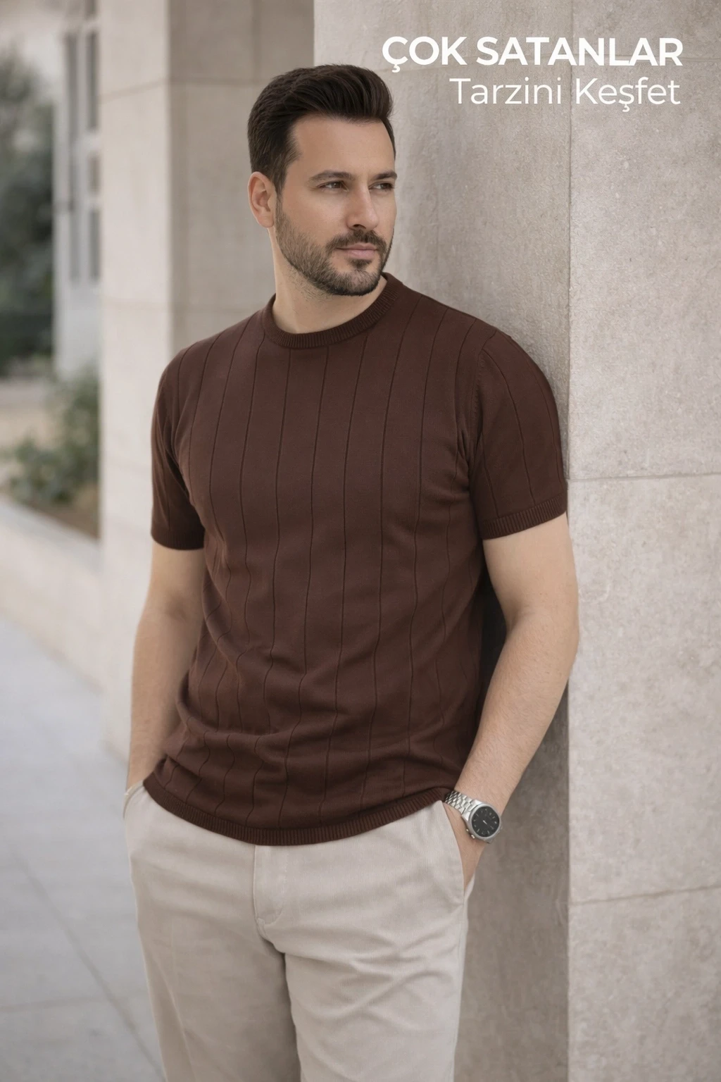 Erkek Yaka Detaylı Tişört Kahverengi Edw463 (Ön sipariş)