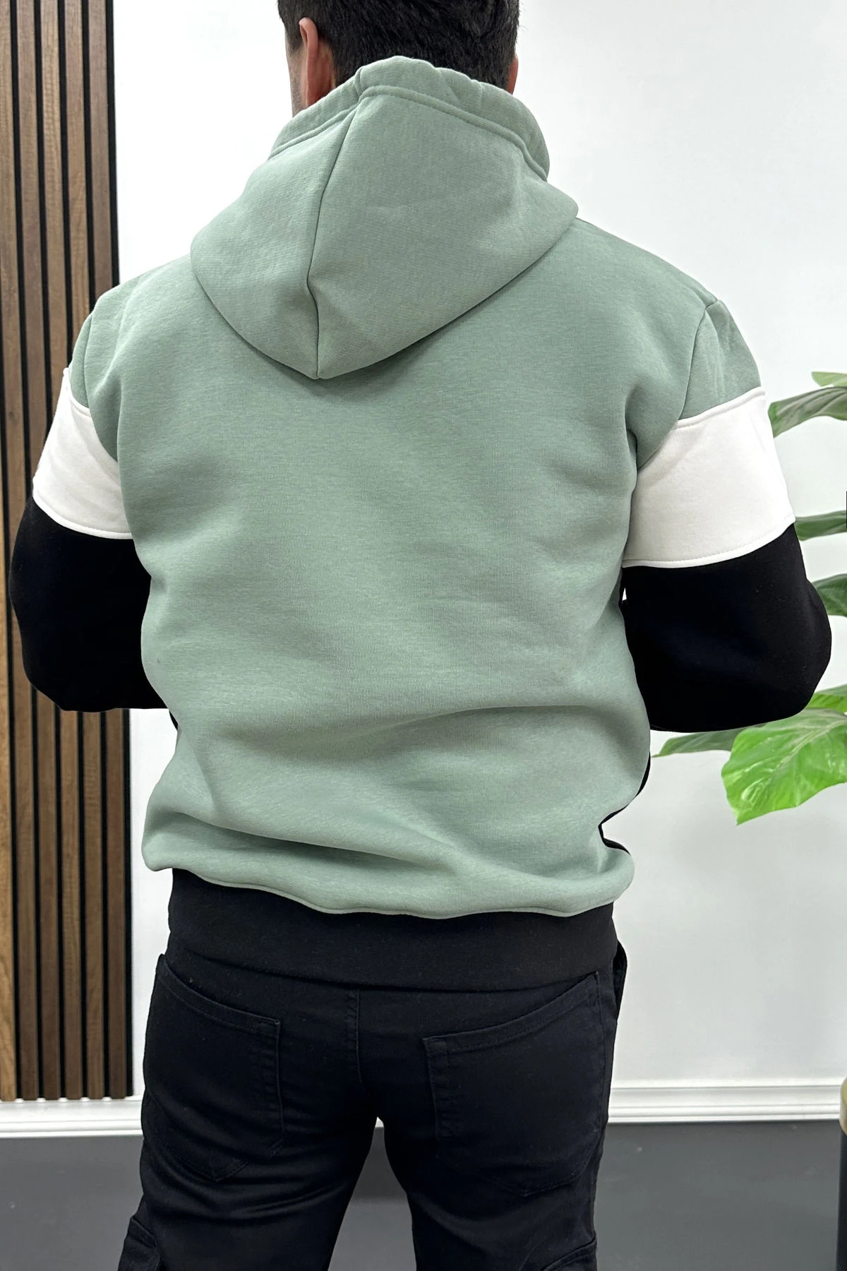 Erkek Slim Fit Renk Bloklu Kapüşonlu Sweatshirt Açık Yeşil Edw438