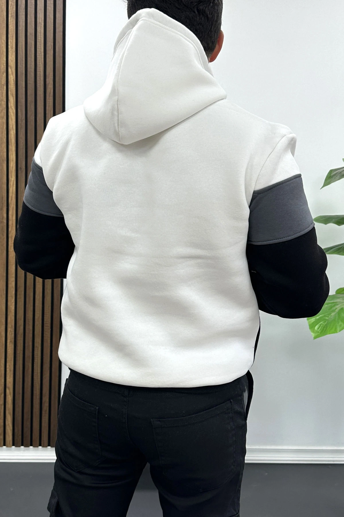 Erkek Slim Fit Renk Bloklu Kapüşonlu Sweatshirt Beyaz Edw438