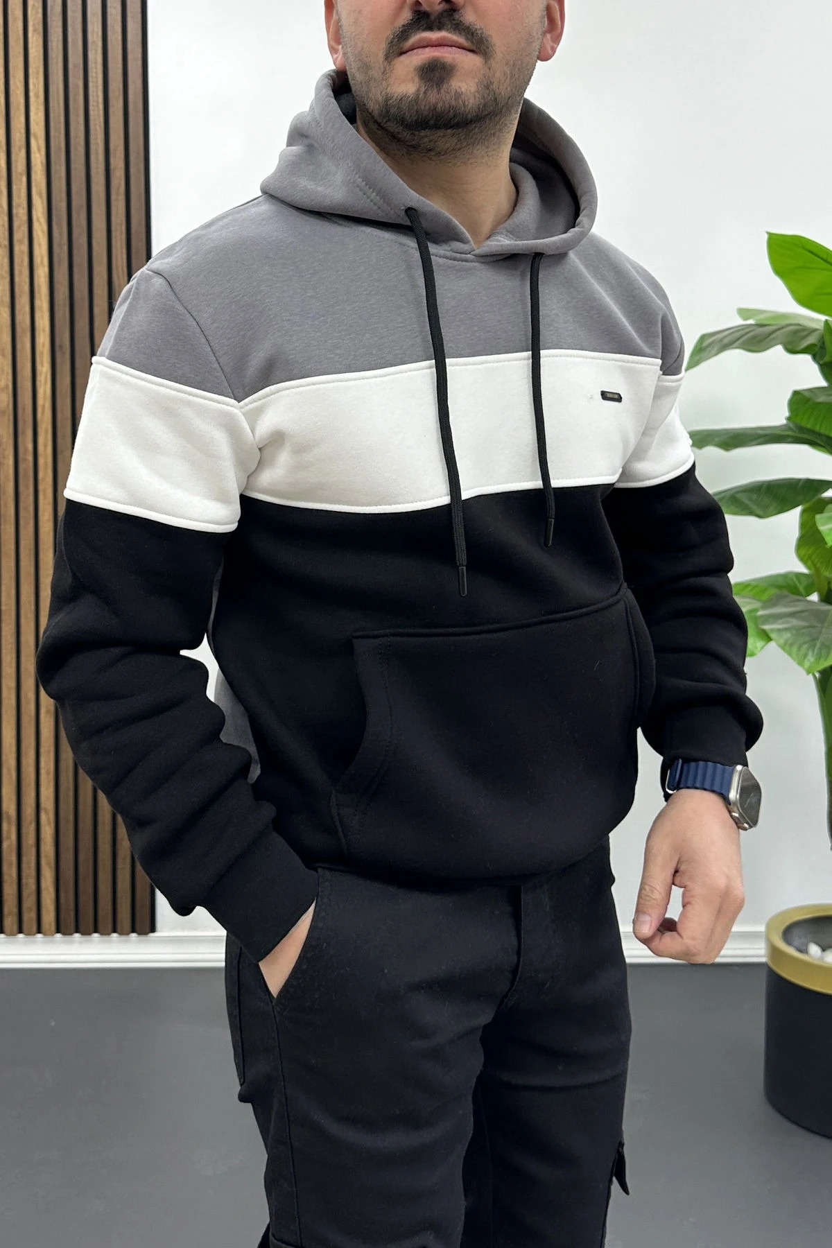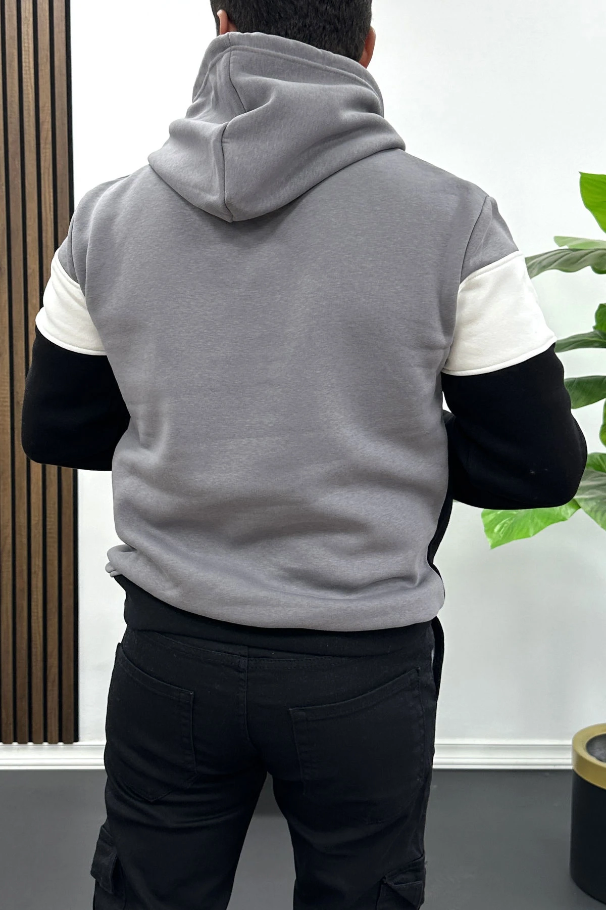 Erkek Slim Fit Renk Bloklu Kapüşonlu Sweatshirt Füme Edw438