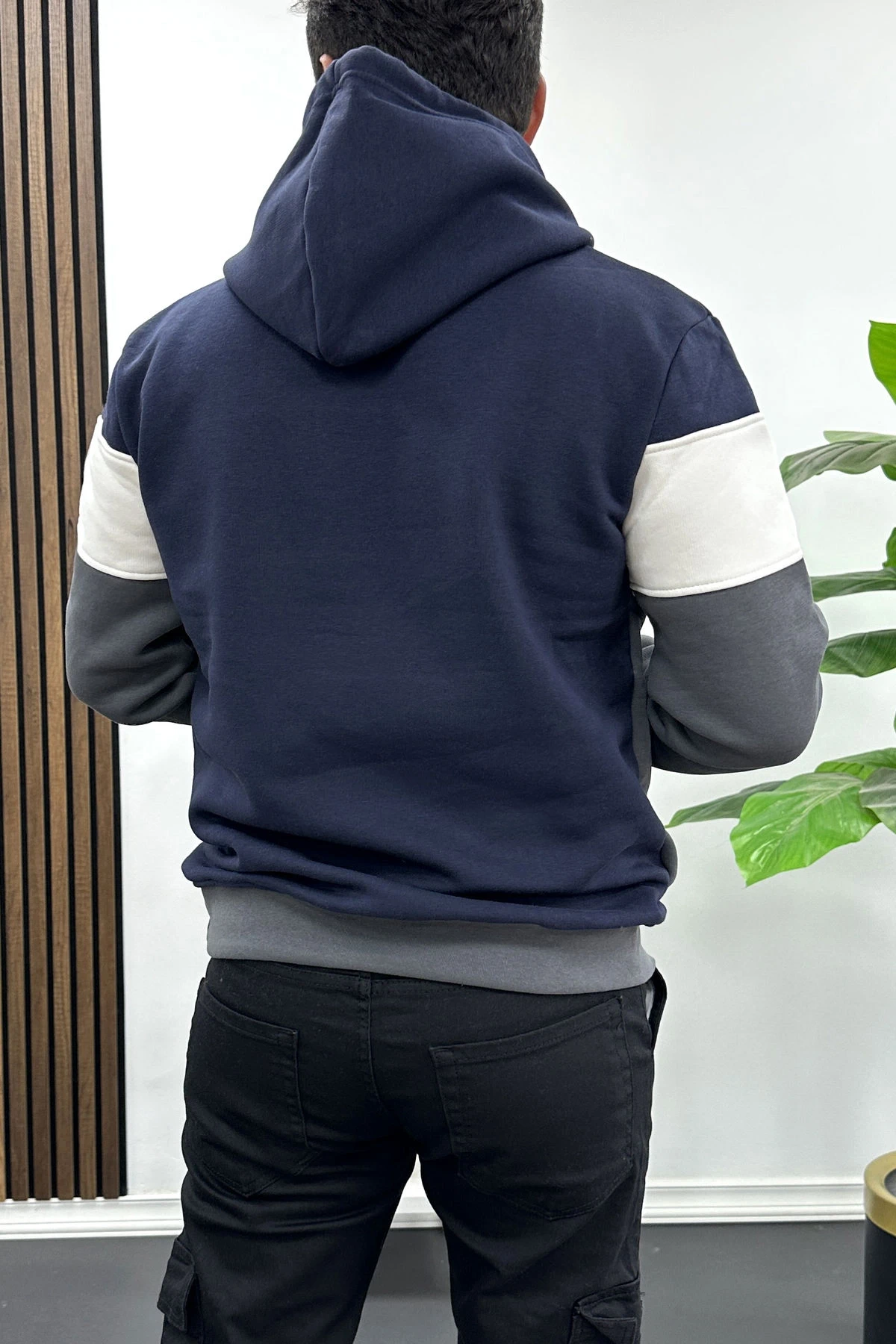 Erkek Slim Fit Renk Bloklu Kapüşonlu Sweatshirt Lacivert Edw438