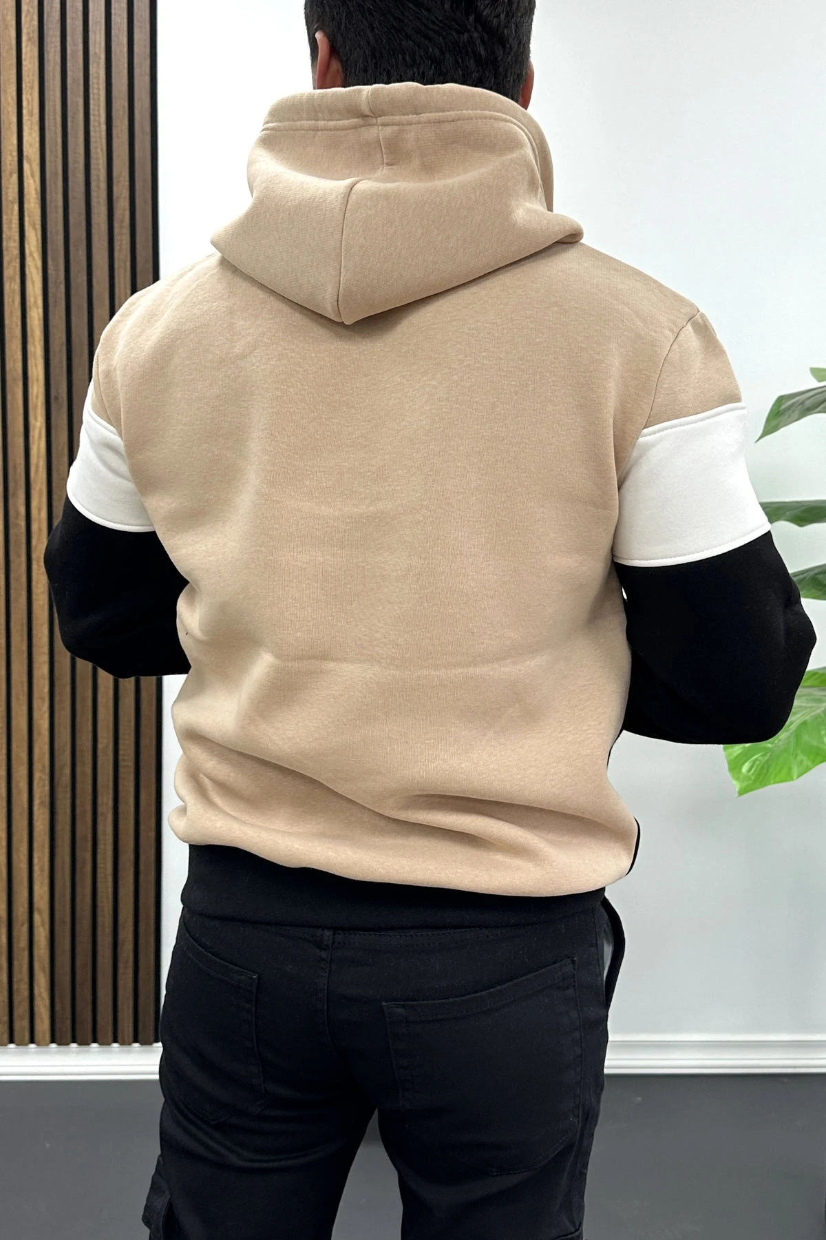 Erkek Slim Fit Renk Bloklu Kapüşonlu Sweatshirt Vizon Edw438