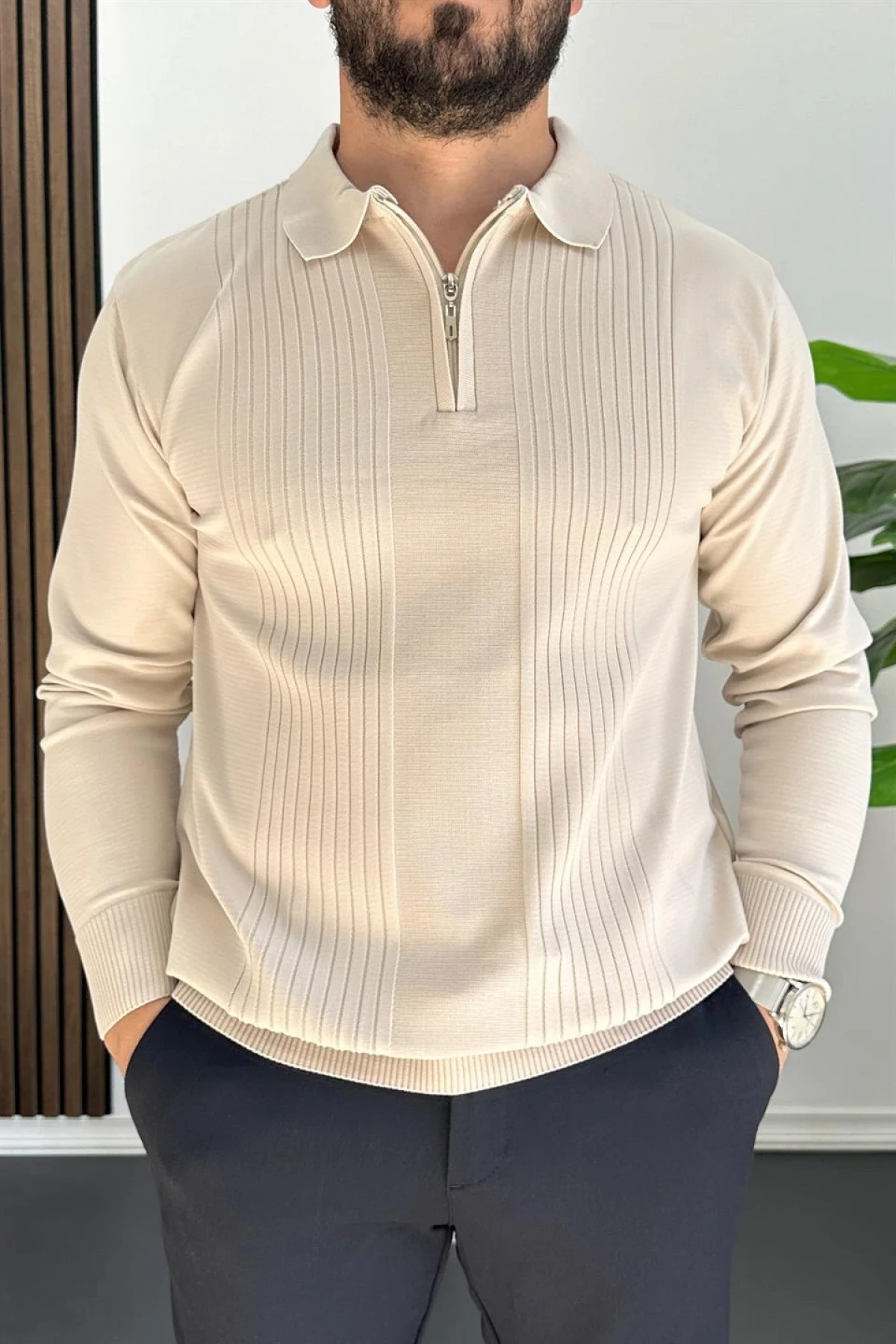 Erkek Yarım Fermuarlı Polo Yaka Mevsimlik Kazak Krem Edw195