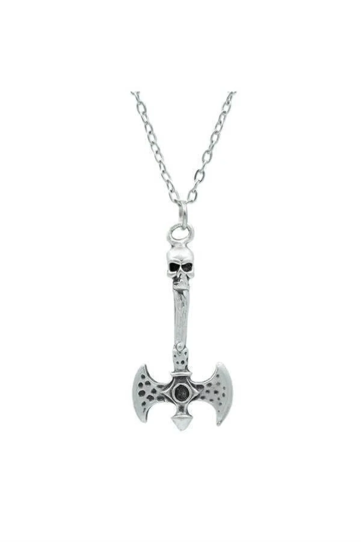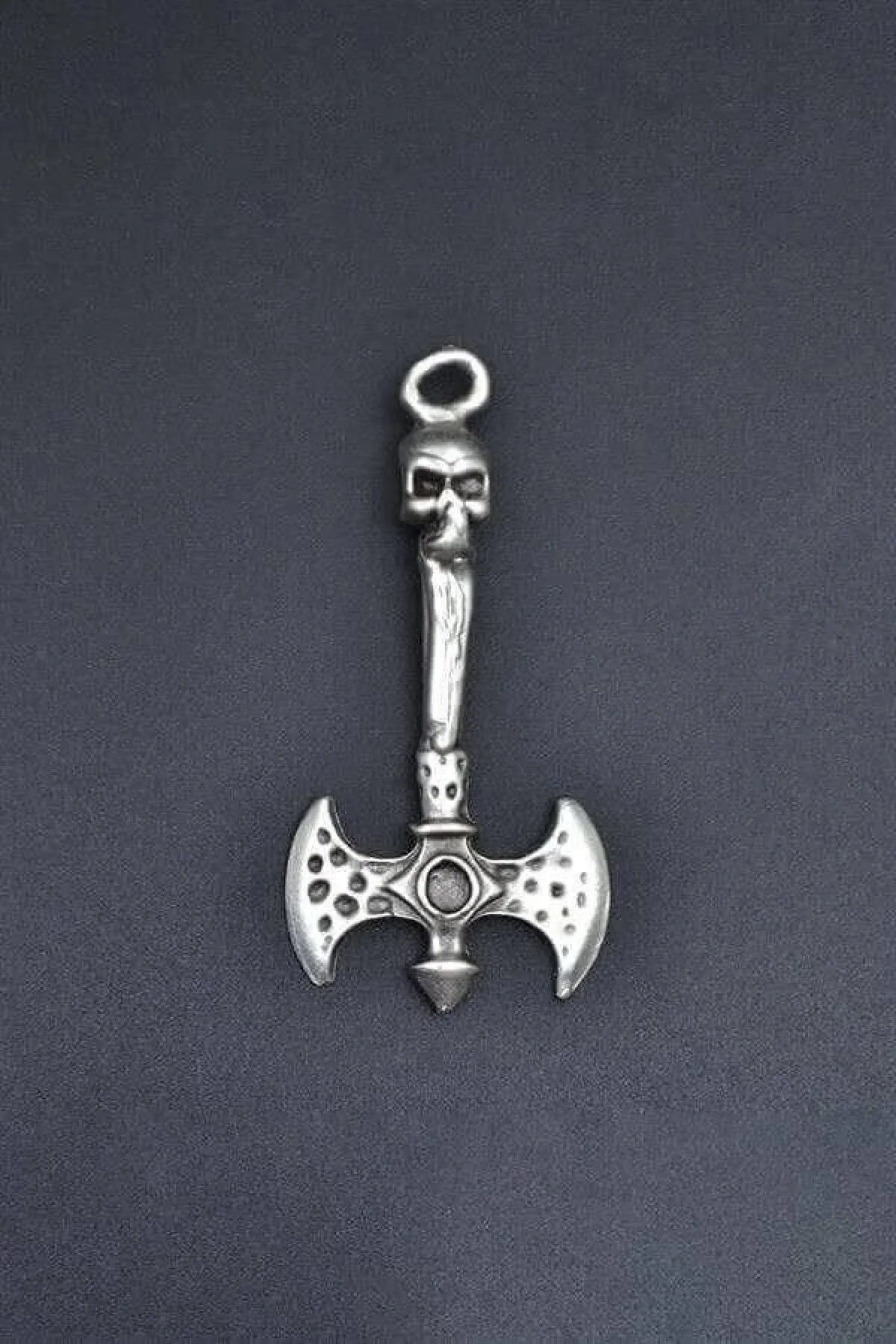 Çift Taraflı Savaşçı Baltası - Kuru Kafa Gümüş Kaplama Kolye
