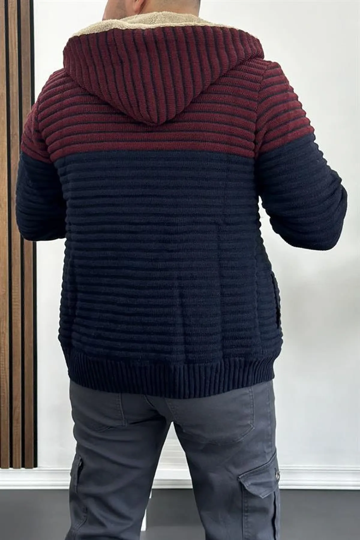 Erkek İçi Kürklü Kapüşonlu Fermuarlı Triko Hırka Bordo T743