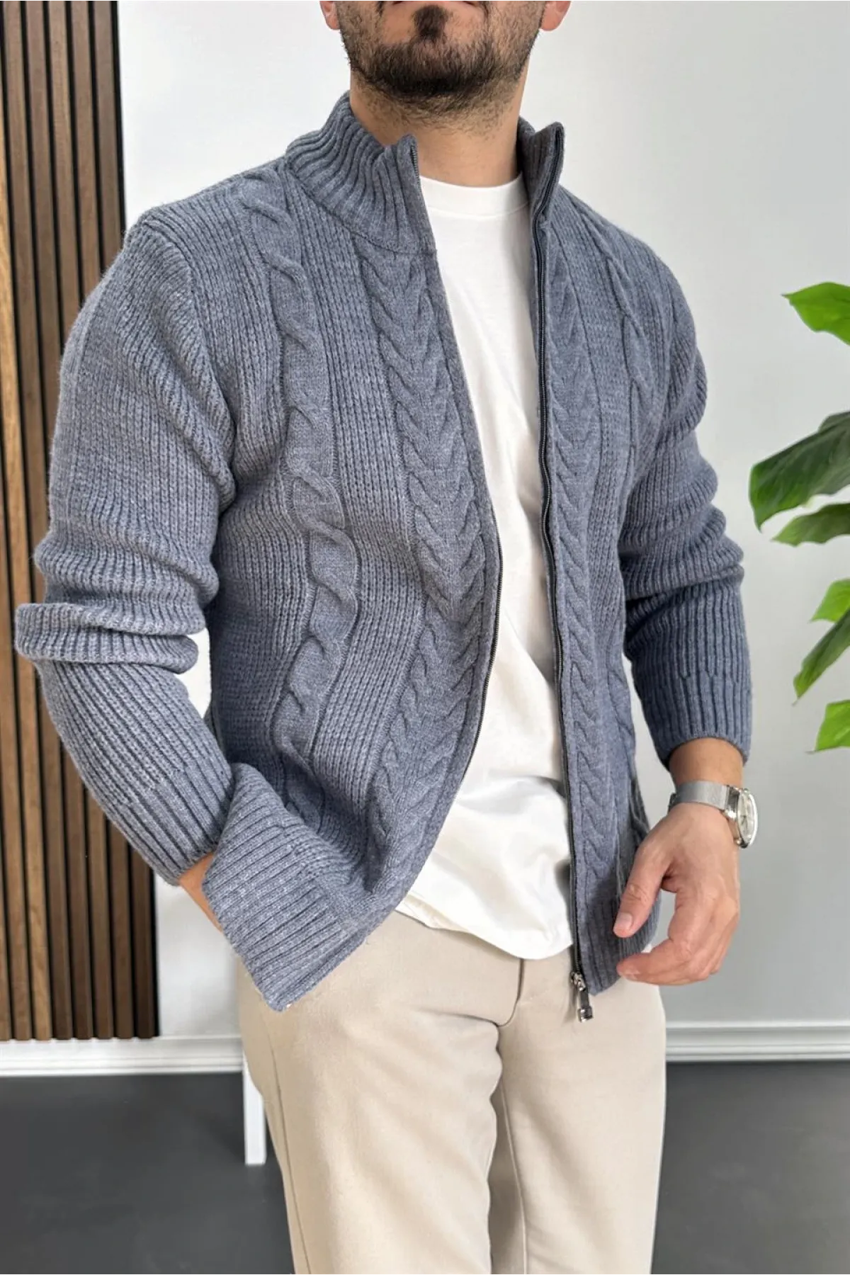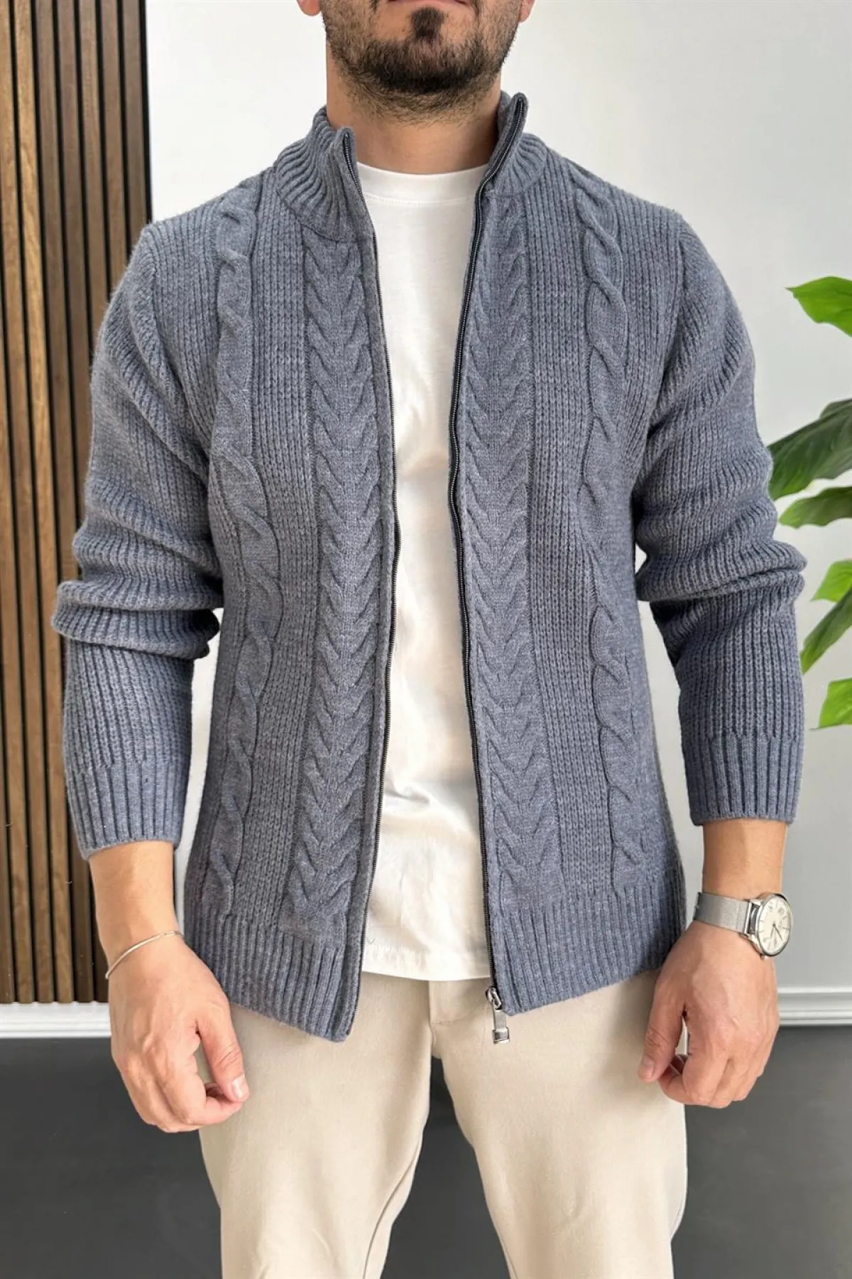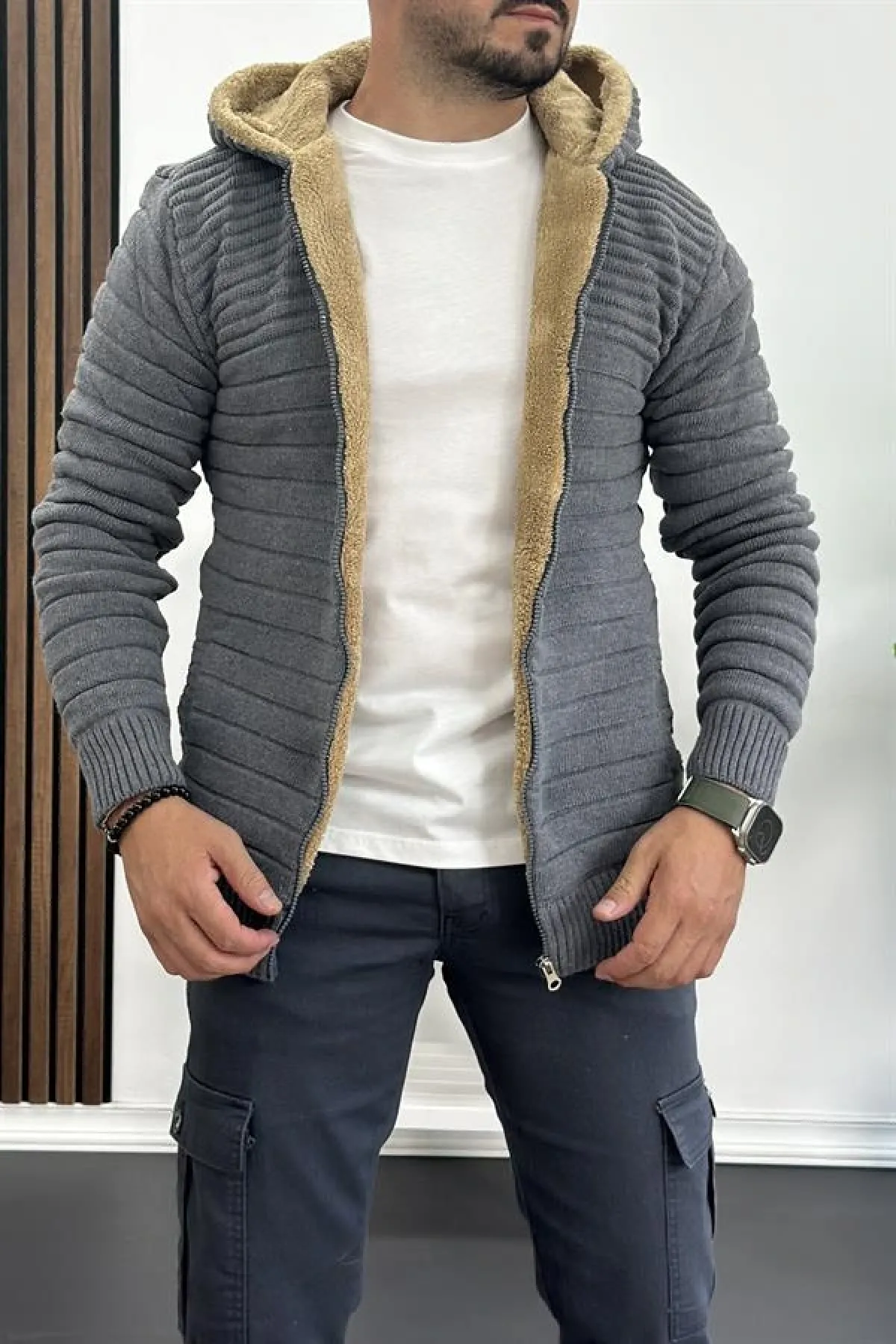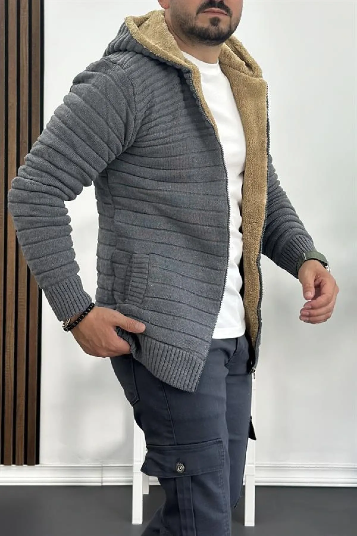 Erkek İçi Kürklü Kapüşonlu Fermuarlı Triko Hırka Gri T743