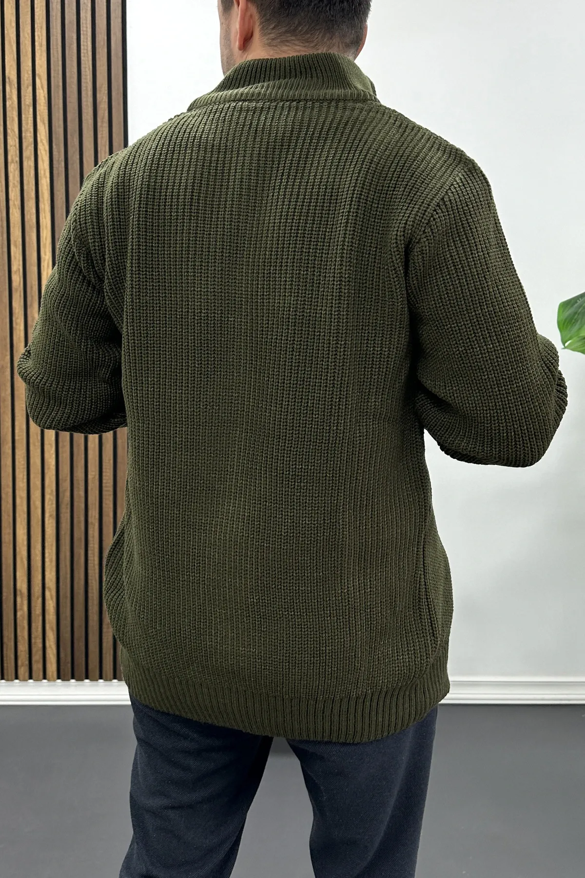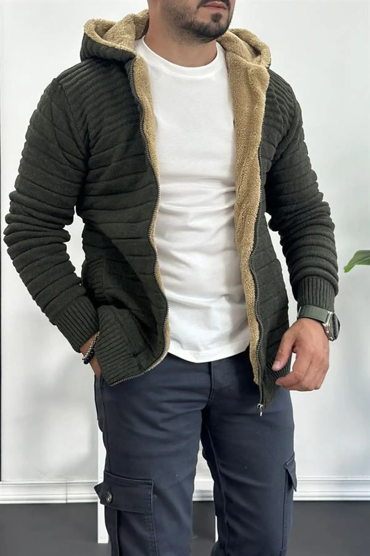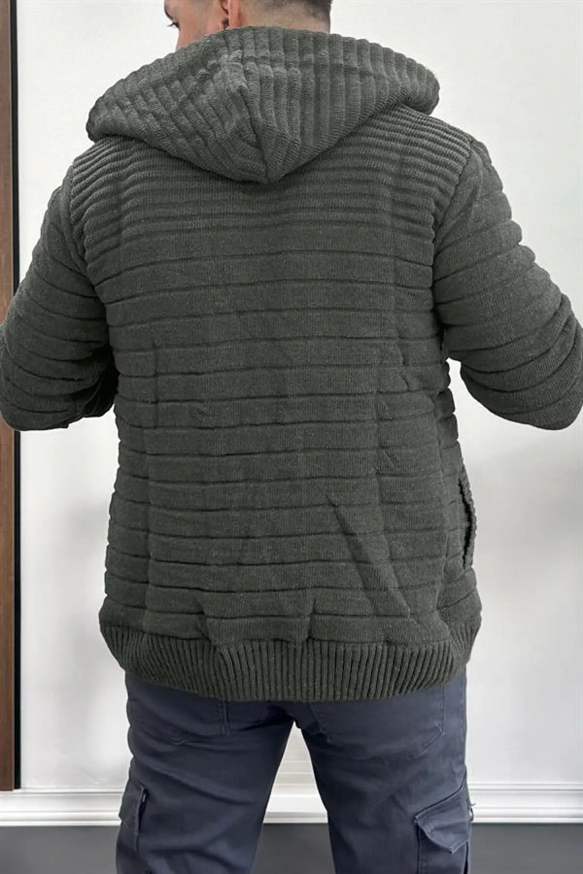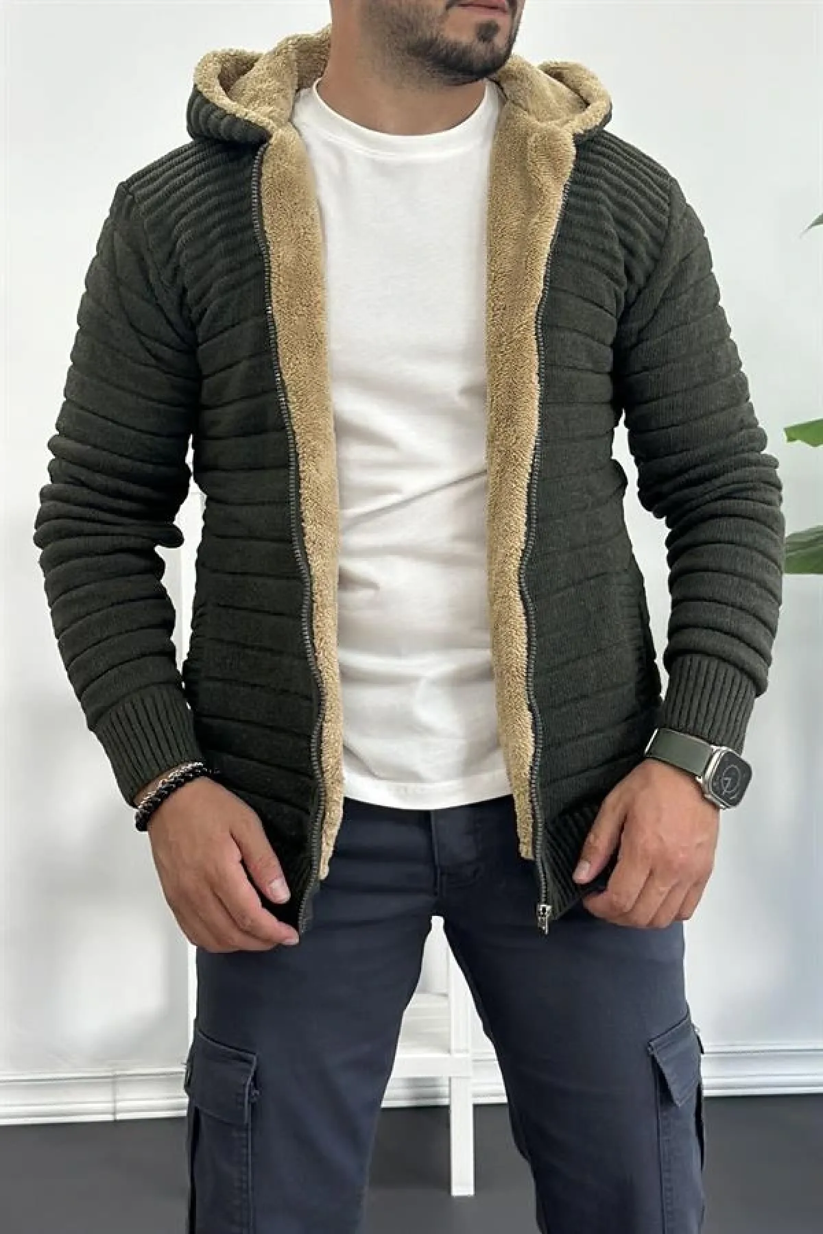 Erkek İçi Kürklü Kapüşonlu Fermuarlı Triko Hırka Yeşil T743