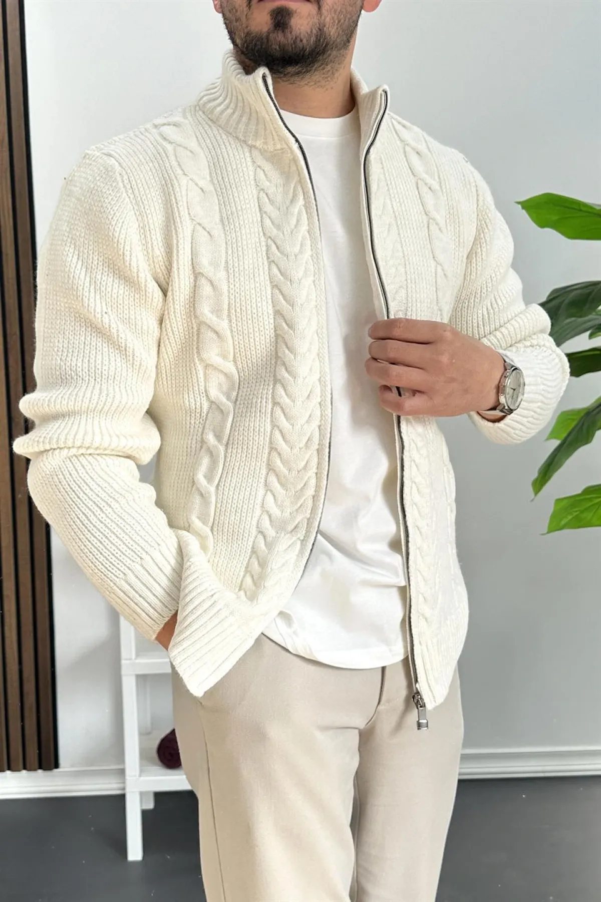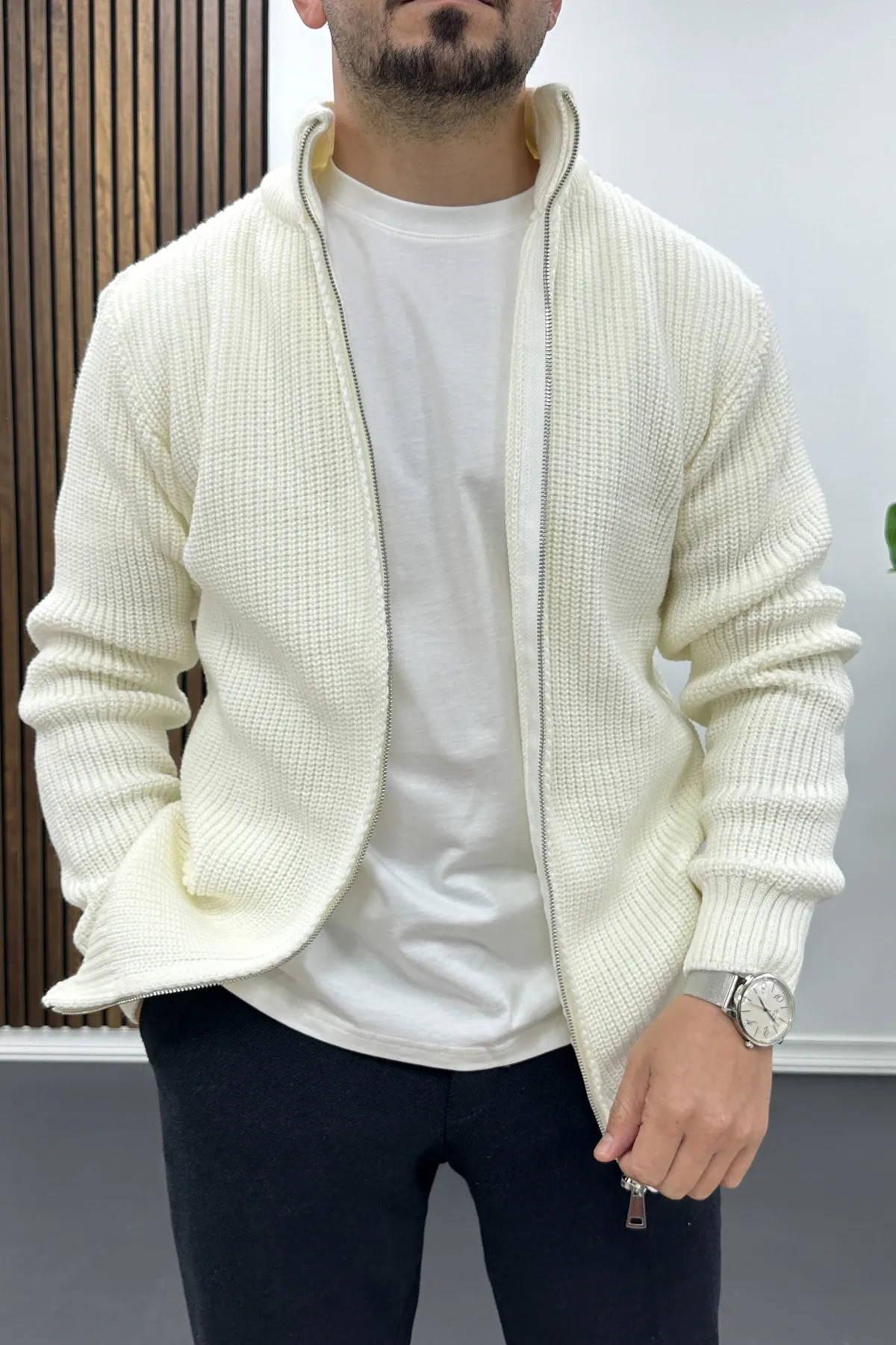 Erkek Slim Fit Fermuarlı Hırka Ekru Edw434