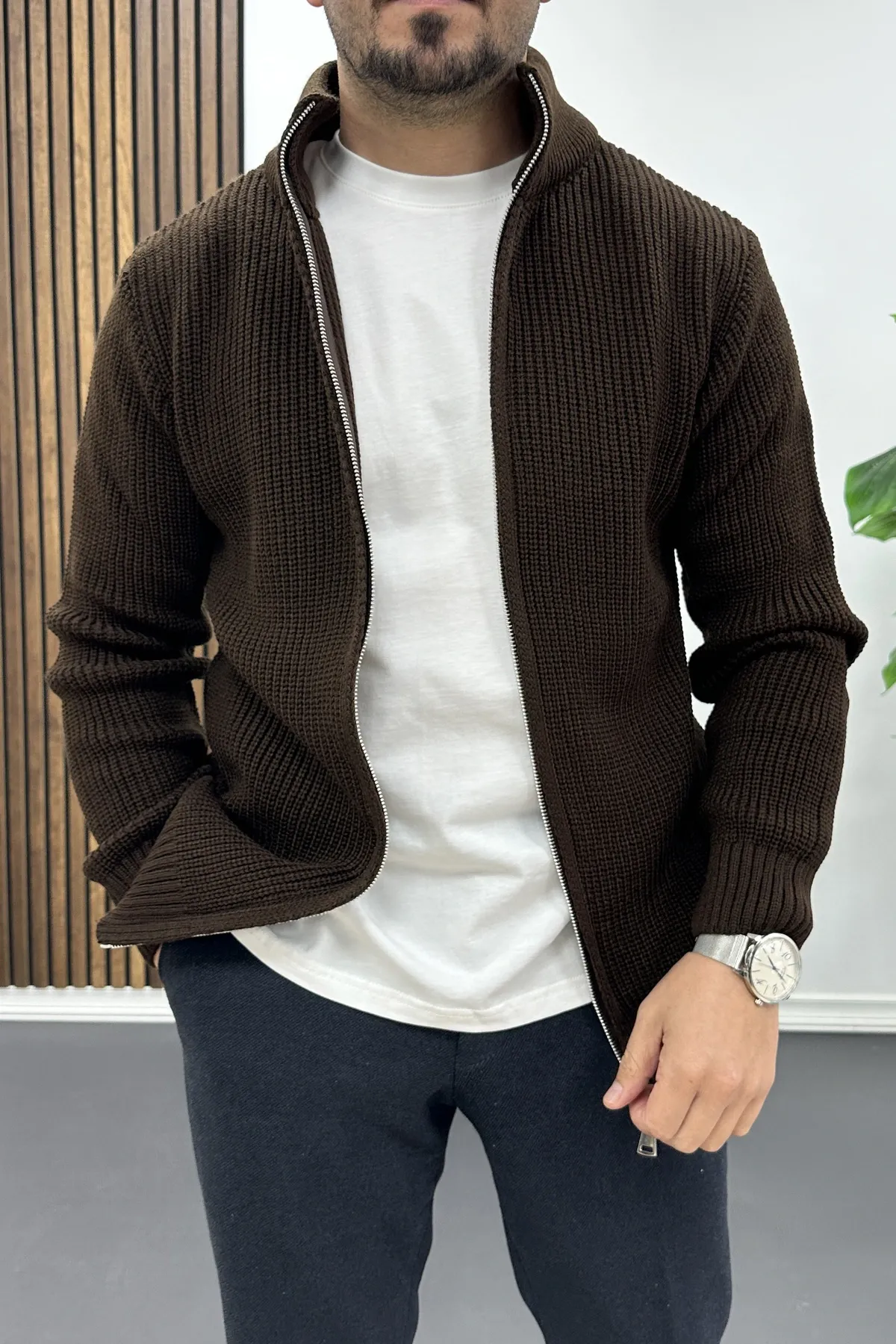 Erkek Slim Fit Fermuarlı Hırka Kahverengi Edw434