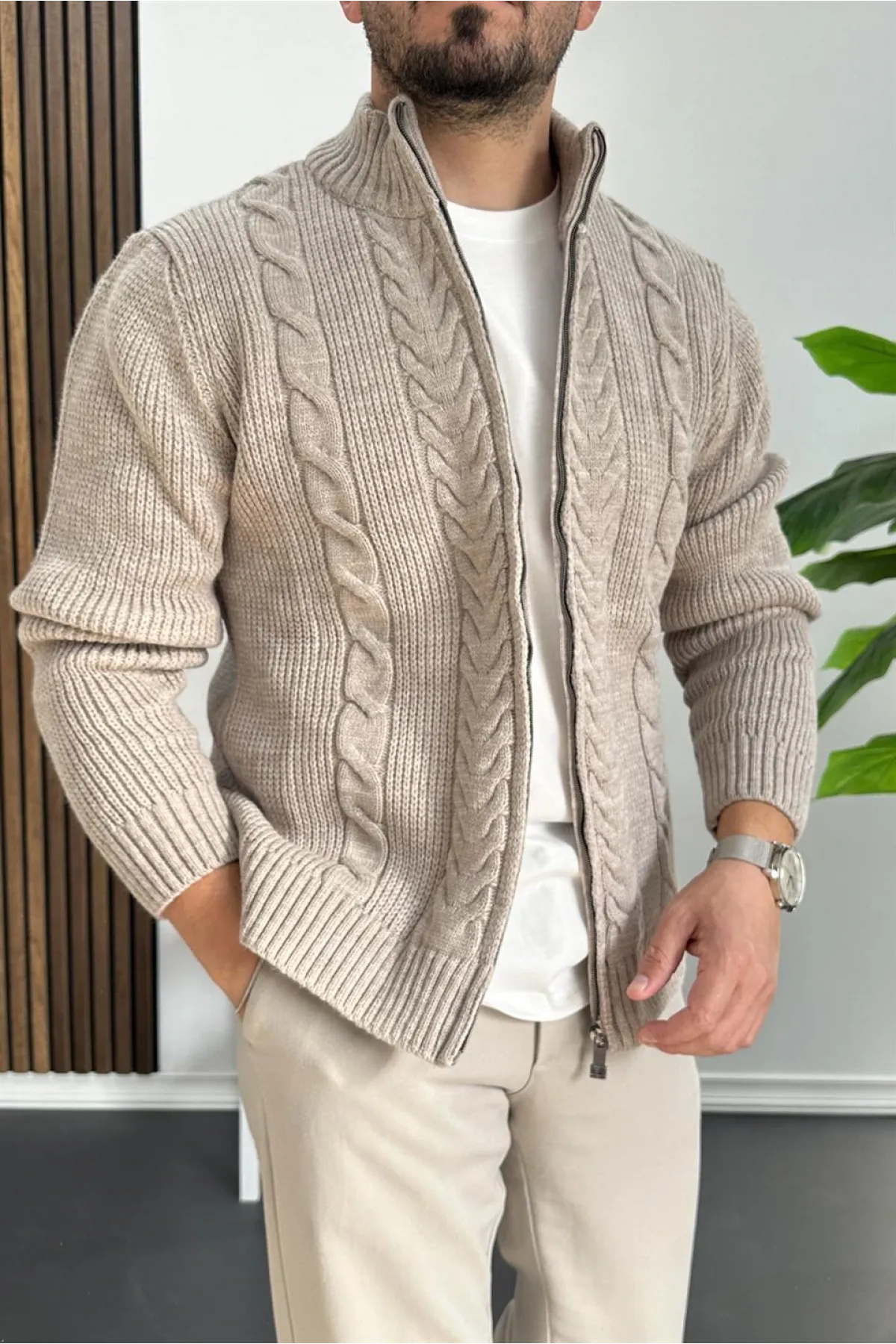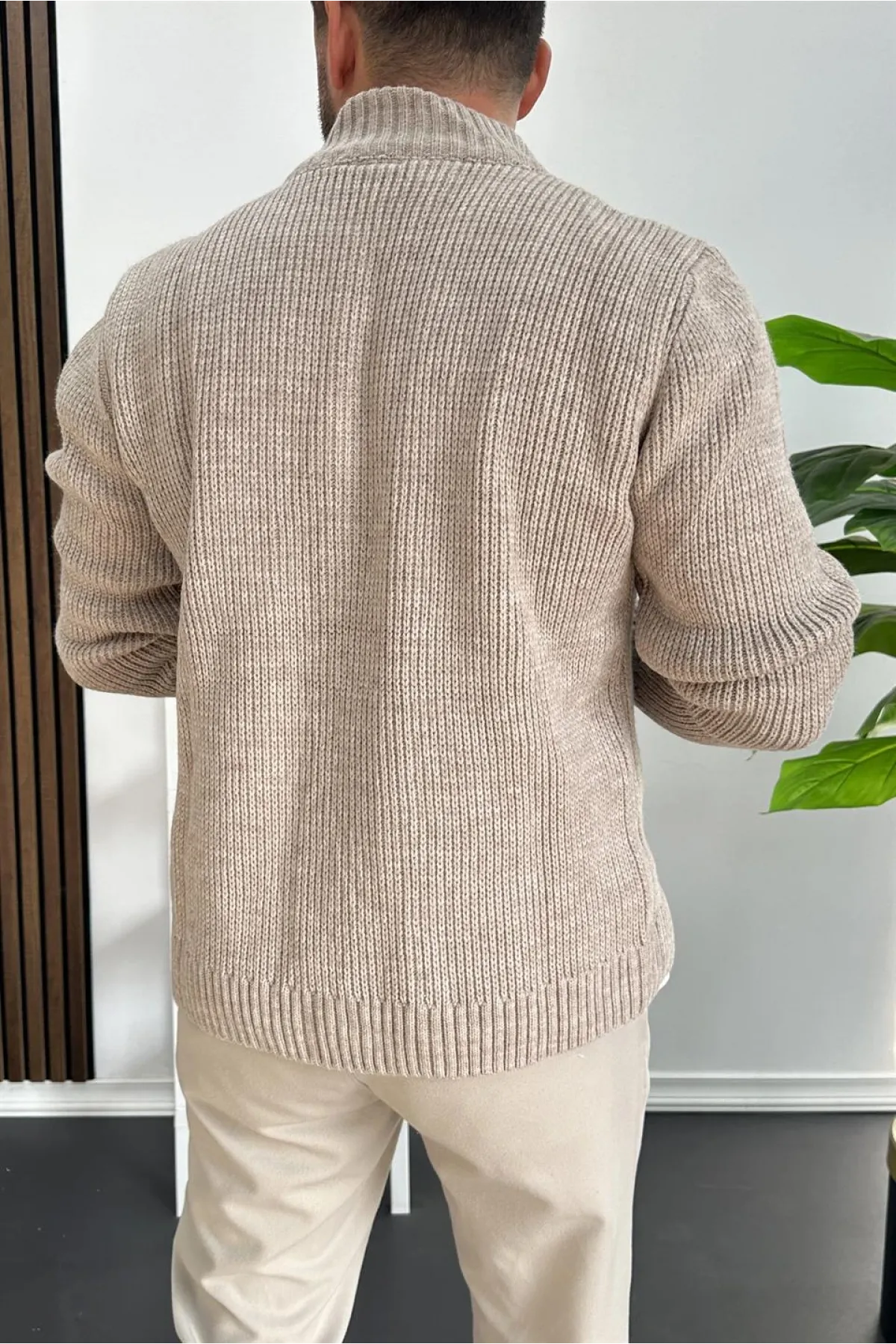 Erkek Slim Fit Fermuarlı Hırka Vizon Edw434