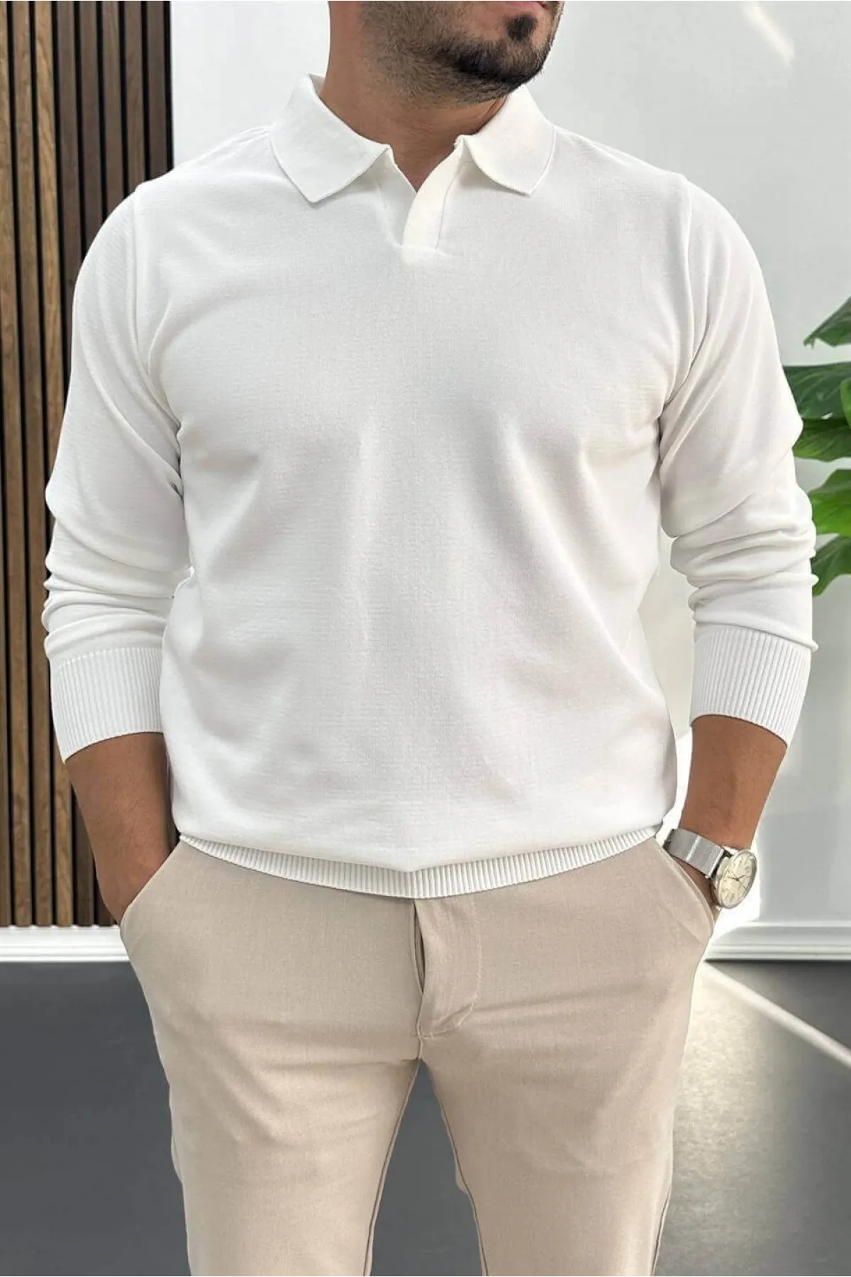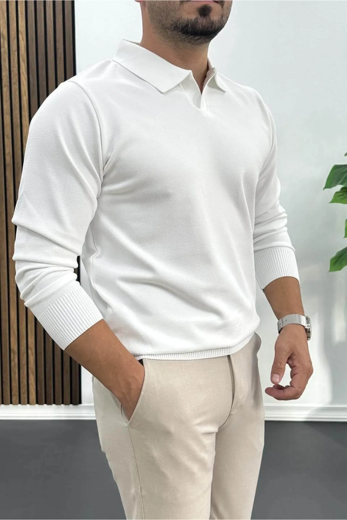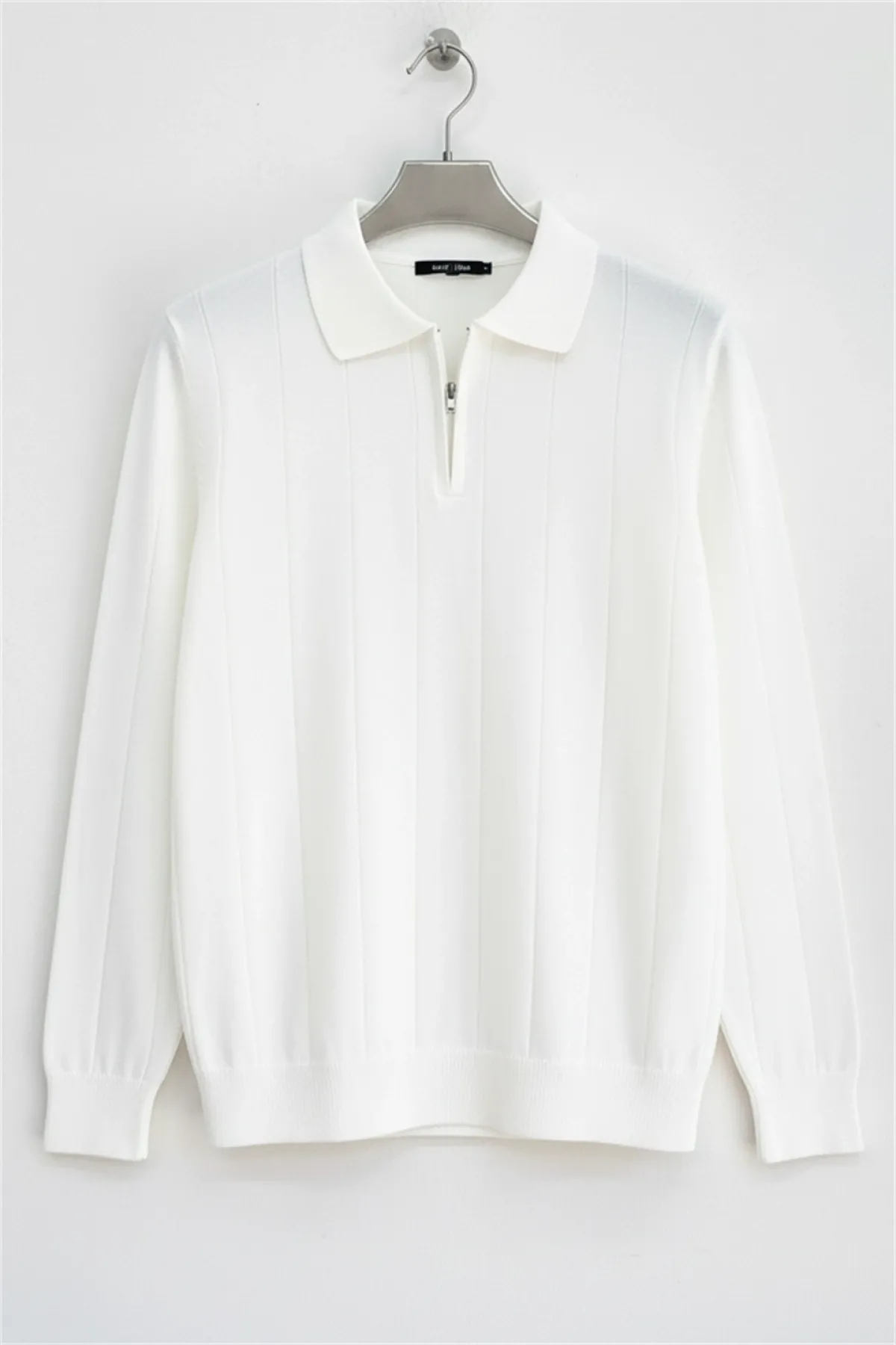 Erkek Yarım Fermuarlı Düz Desen Polo Yaka Kazak Beyaz Edw424