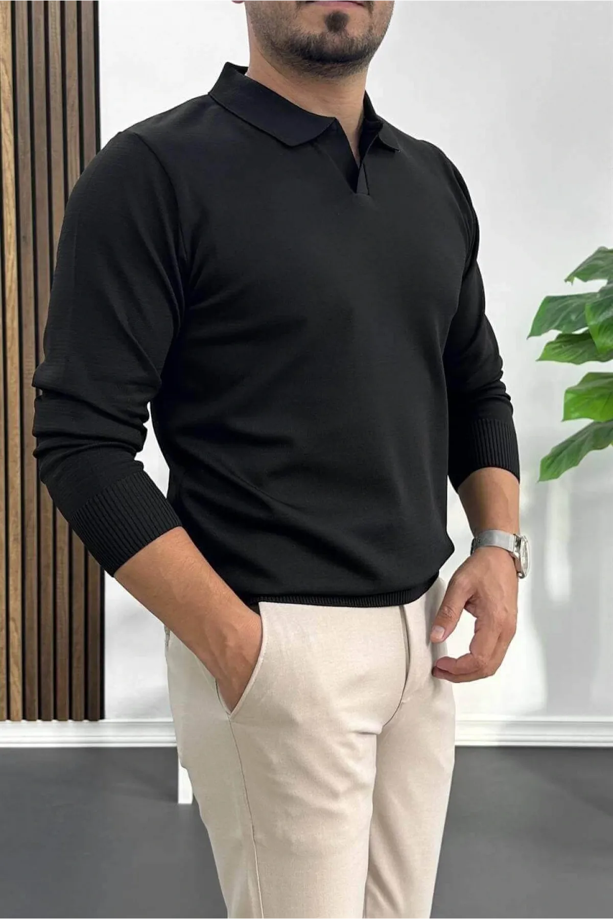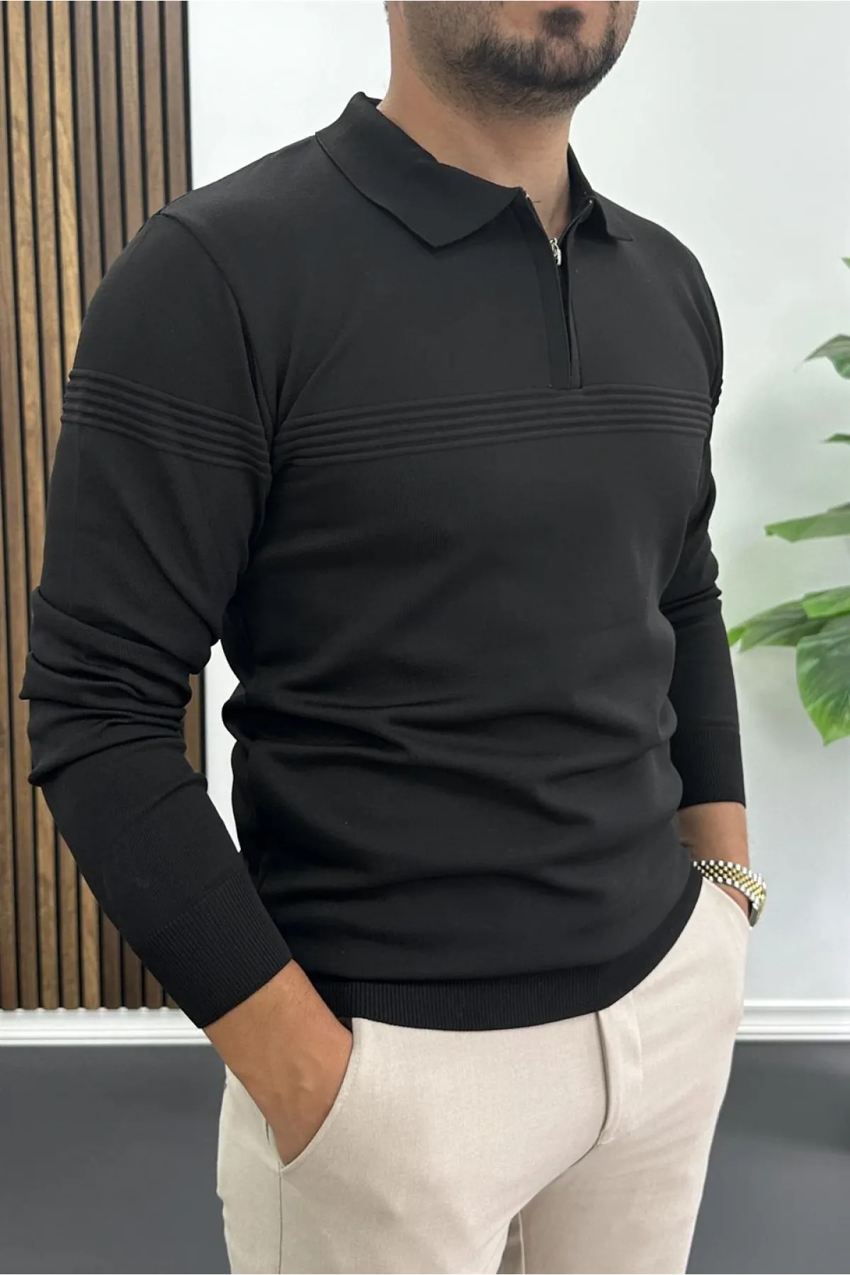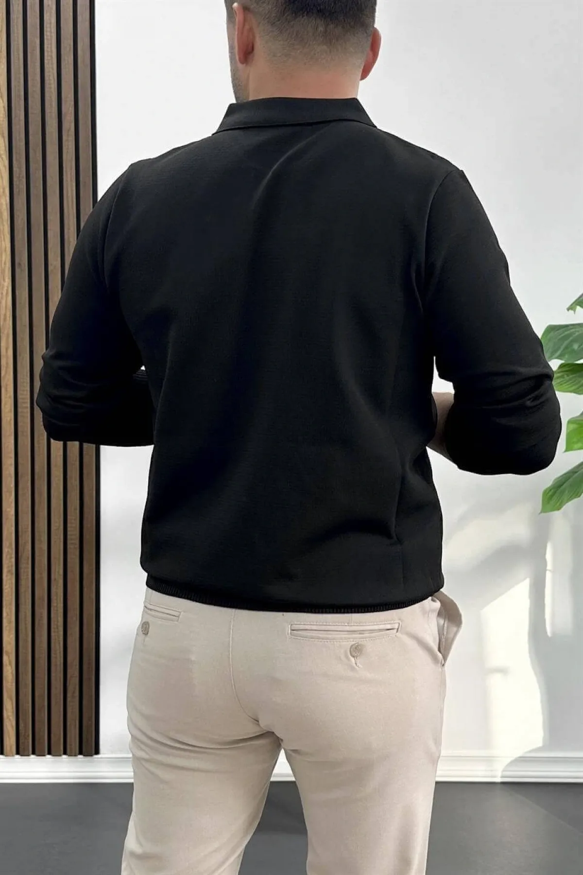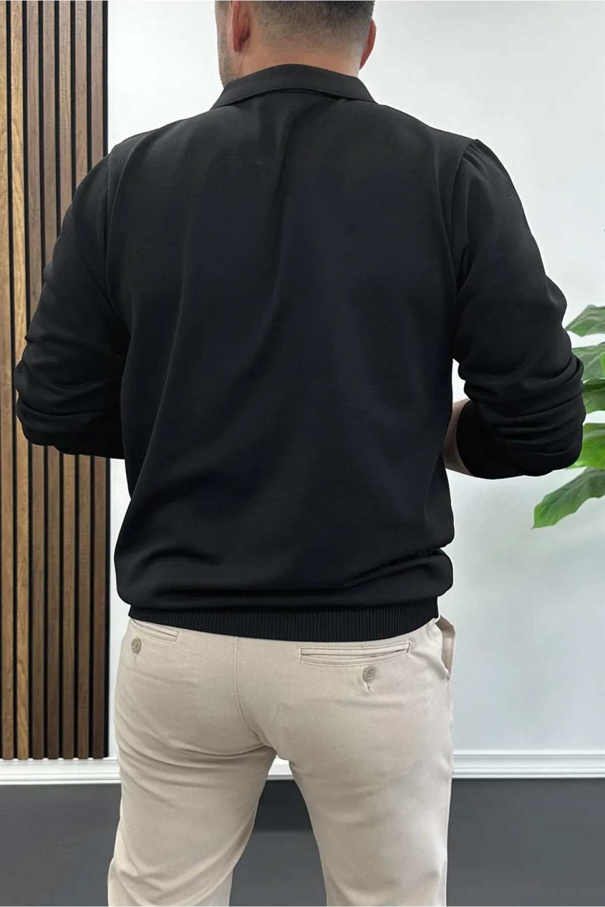 Erkek Yarım Fermuarlı Düz Desen Polo Yaka Kazak Siyah Edw424