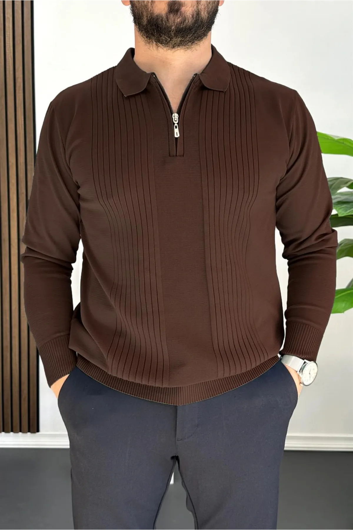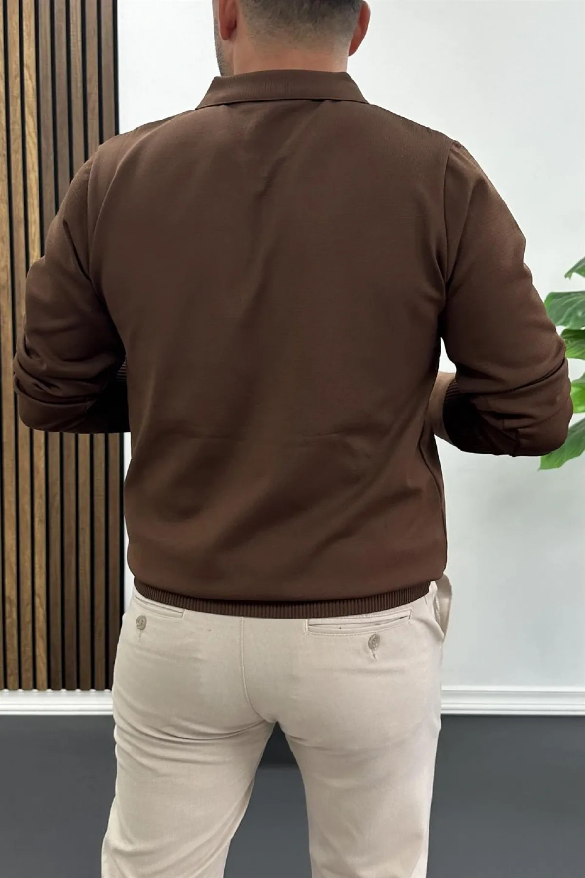 Erkek Yarım Fermuarlı Düz Desen Polo Yaka Kazak Kahverengi Edw424