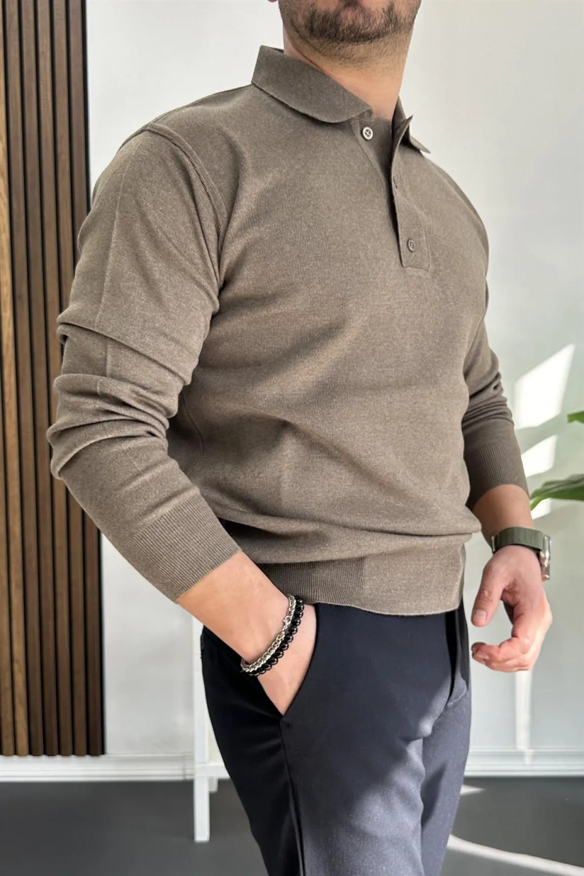 Erkek Düğmeli Polo Yaka Kazak Açık Kahverengi Edw231