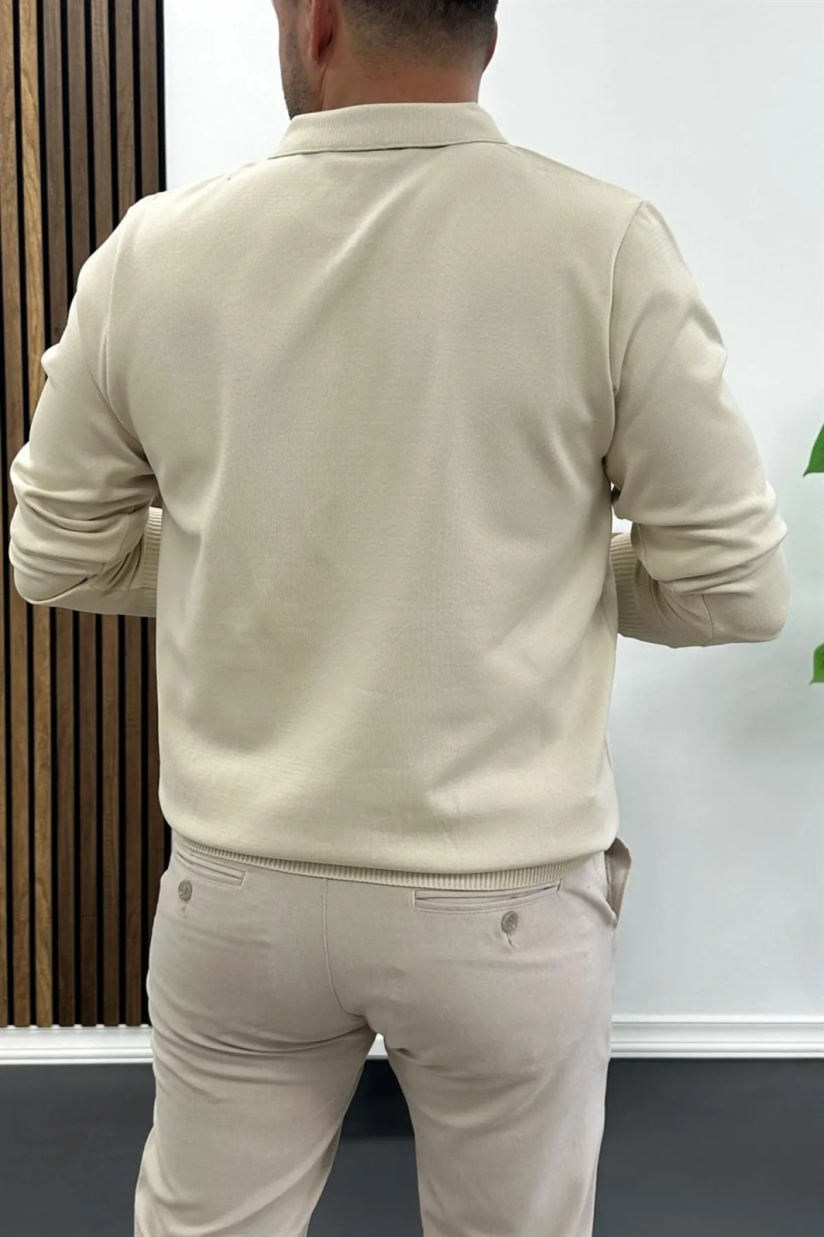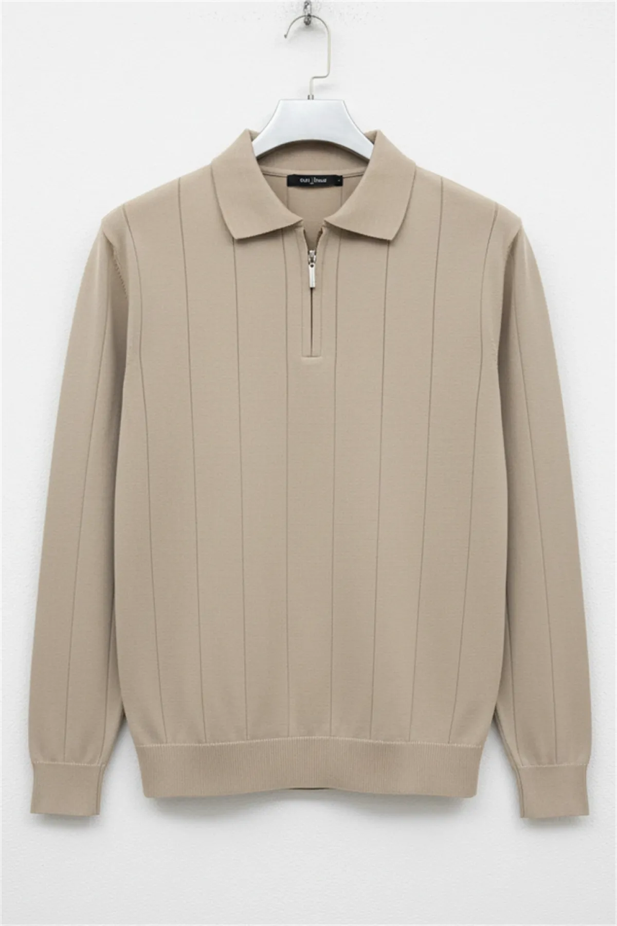 Erkek Yarım Fermuarlı Polo Yaka Mevsimlik Kazak Vizon Edw195