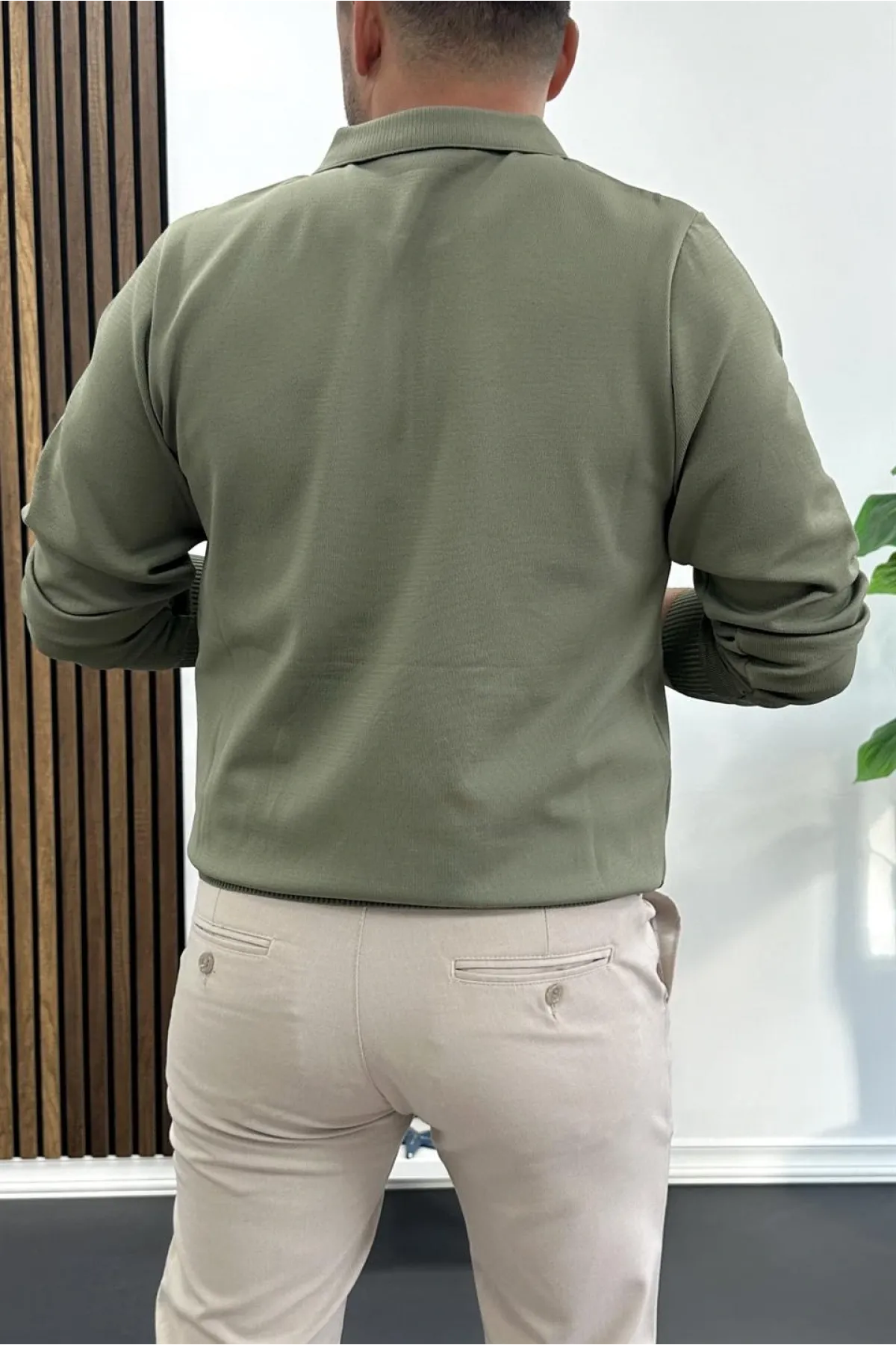 Erkek Yarım Fermuarlı Düz Desen Polo Yaka Kazak Haki Edw424