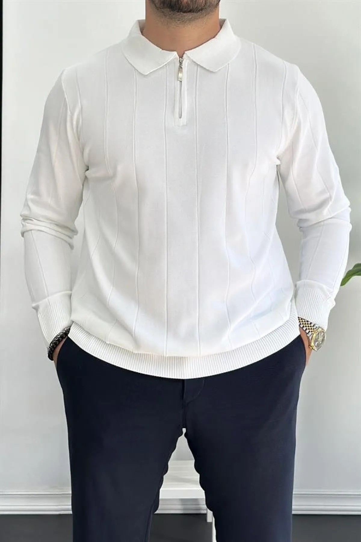 Erkek Yarım Fermuarlı Polo Yaka Mevsimlik Kazak Beyaz Edw195