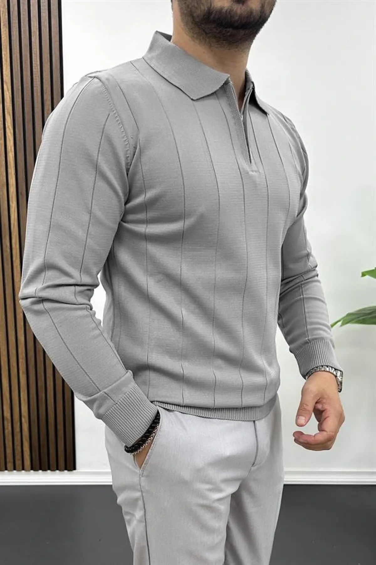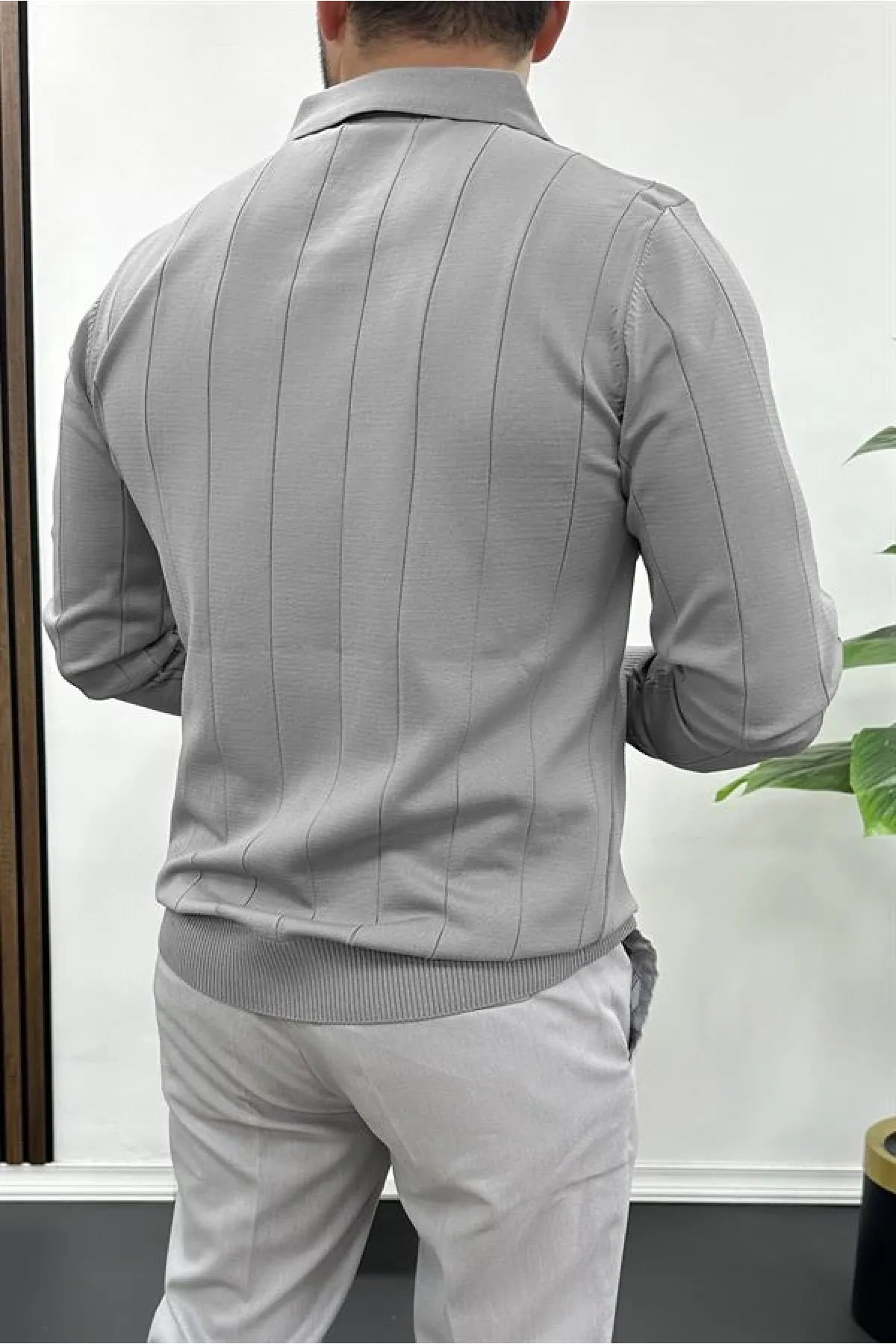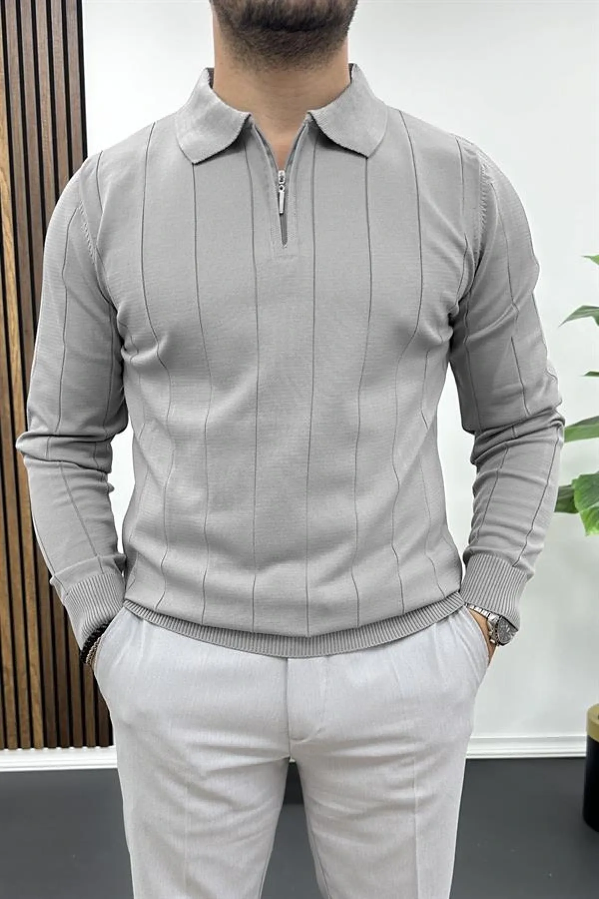 Erkek Yarım Fermuarlı Polo Yaka Mevsimlik Kazak Gri Edw195