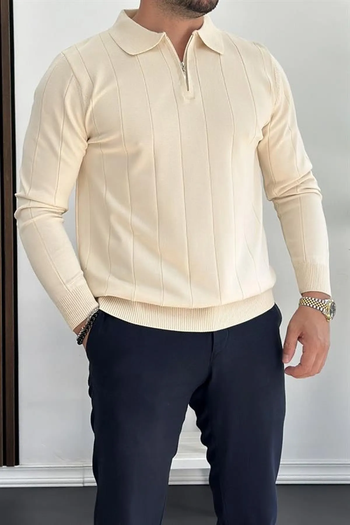 Erkek Yarım Fermuarlı Polo Yaka Mevsimlik Kazak Krem Edw195