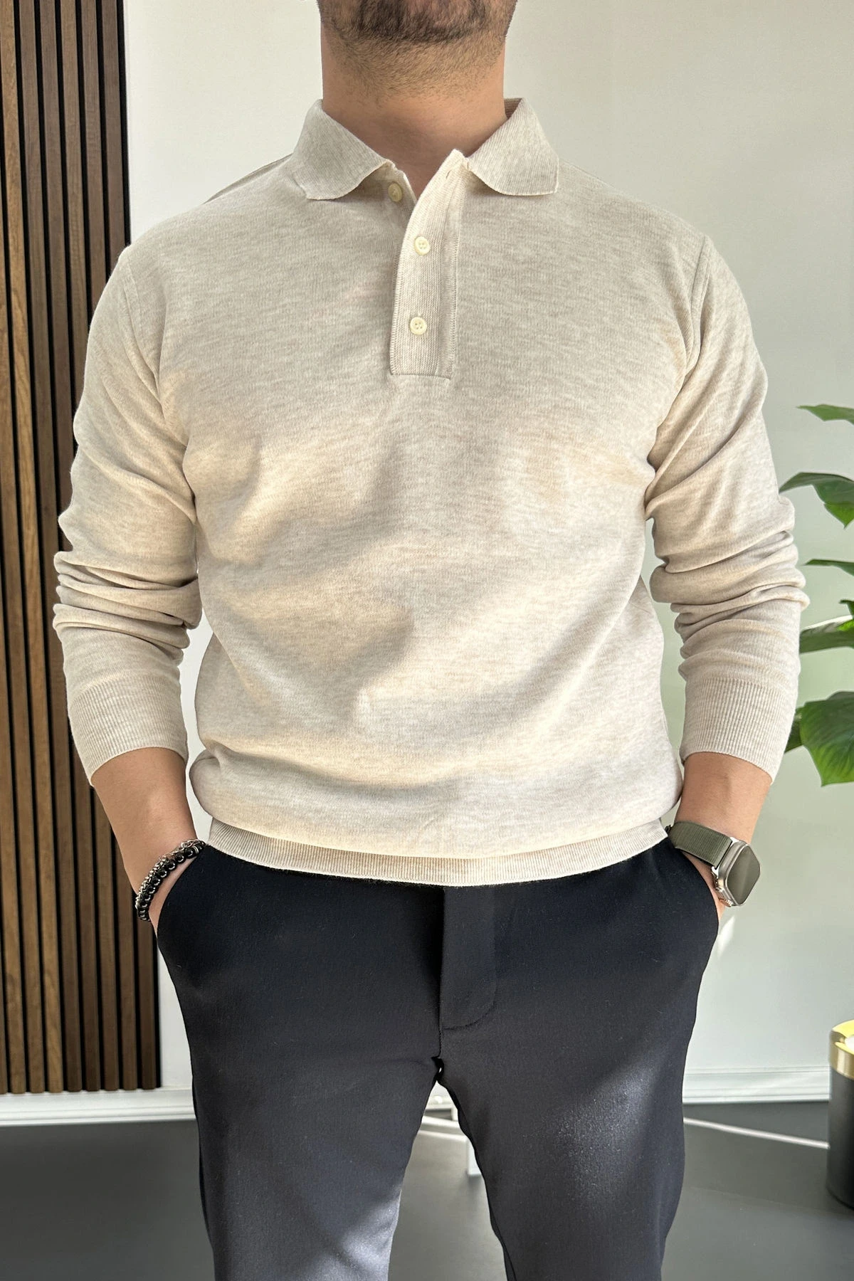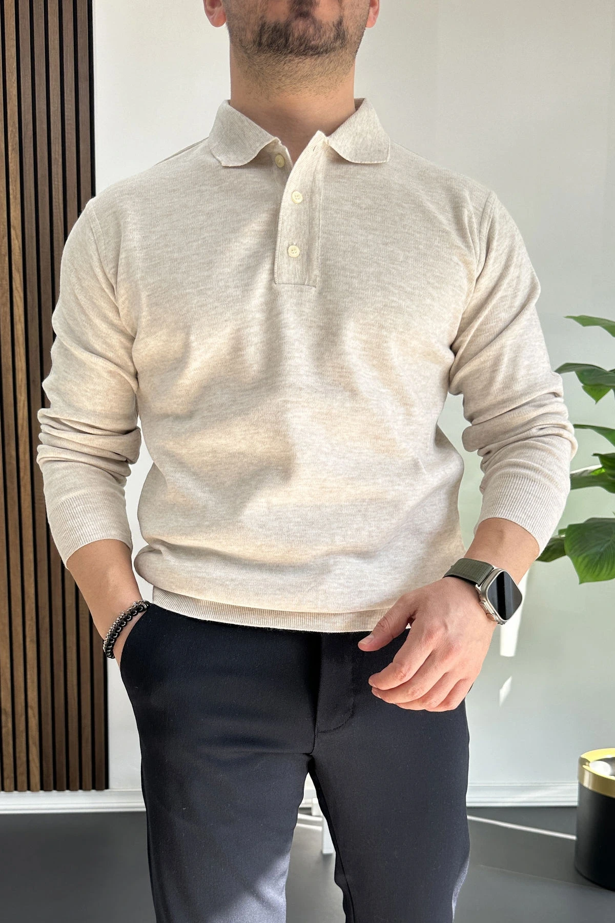 Erkek Düğmeli Polo Yaka Kazak Bej Edw231