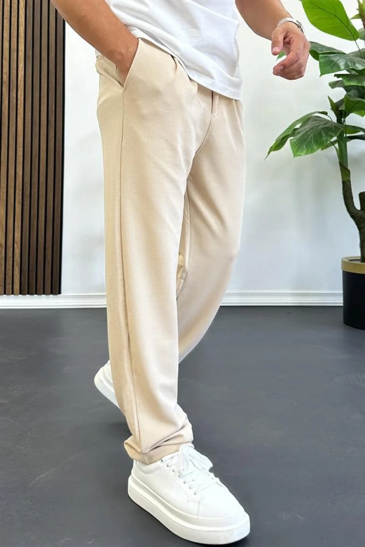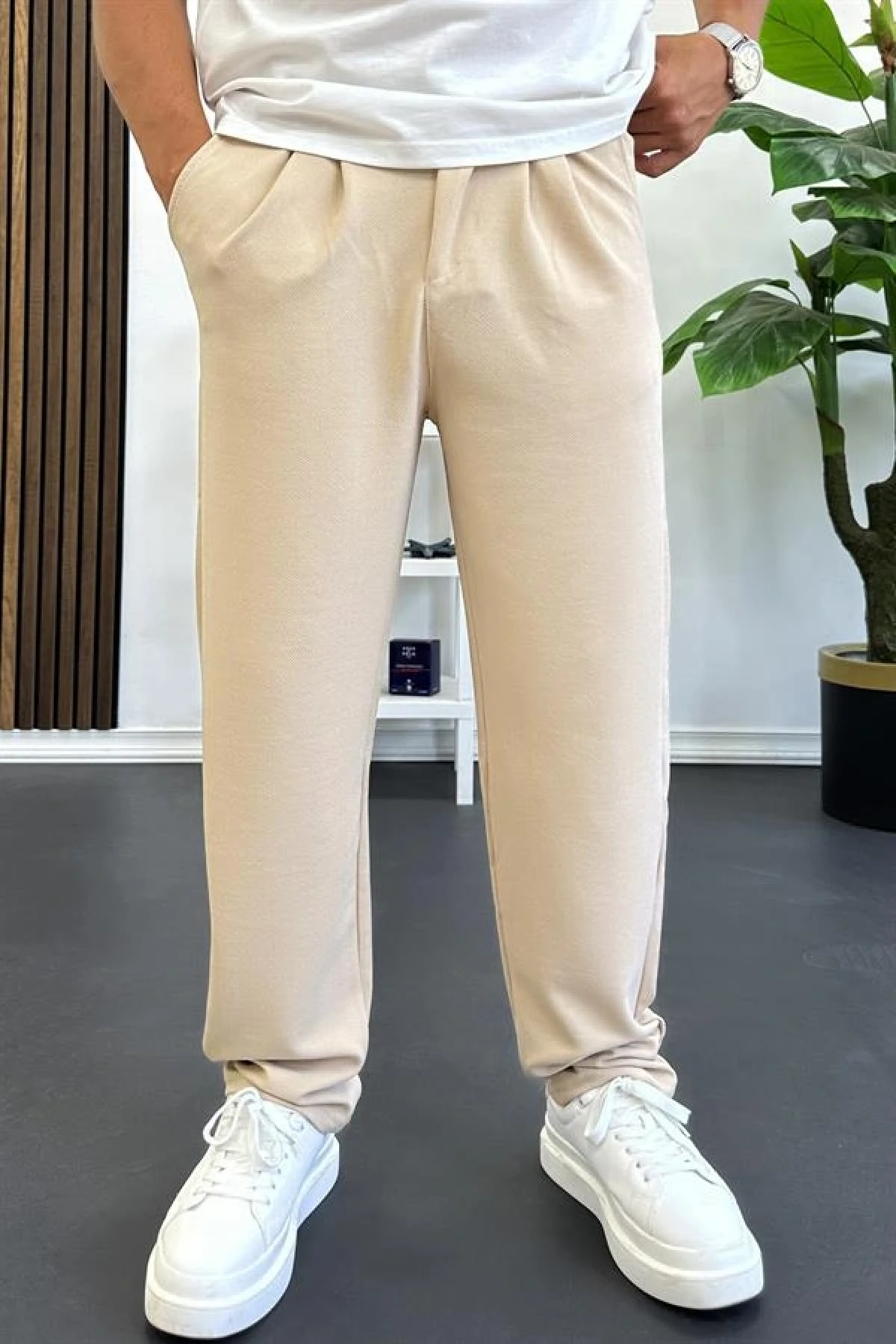 Erkek Rahat Kalıp Pileli Pantolon Krem Edw402