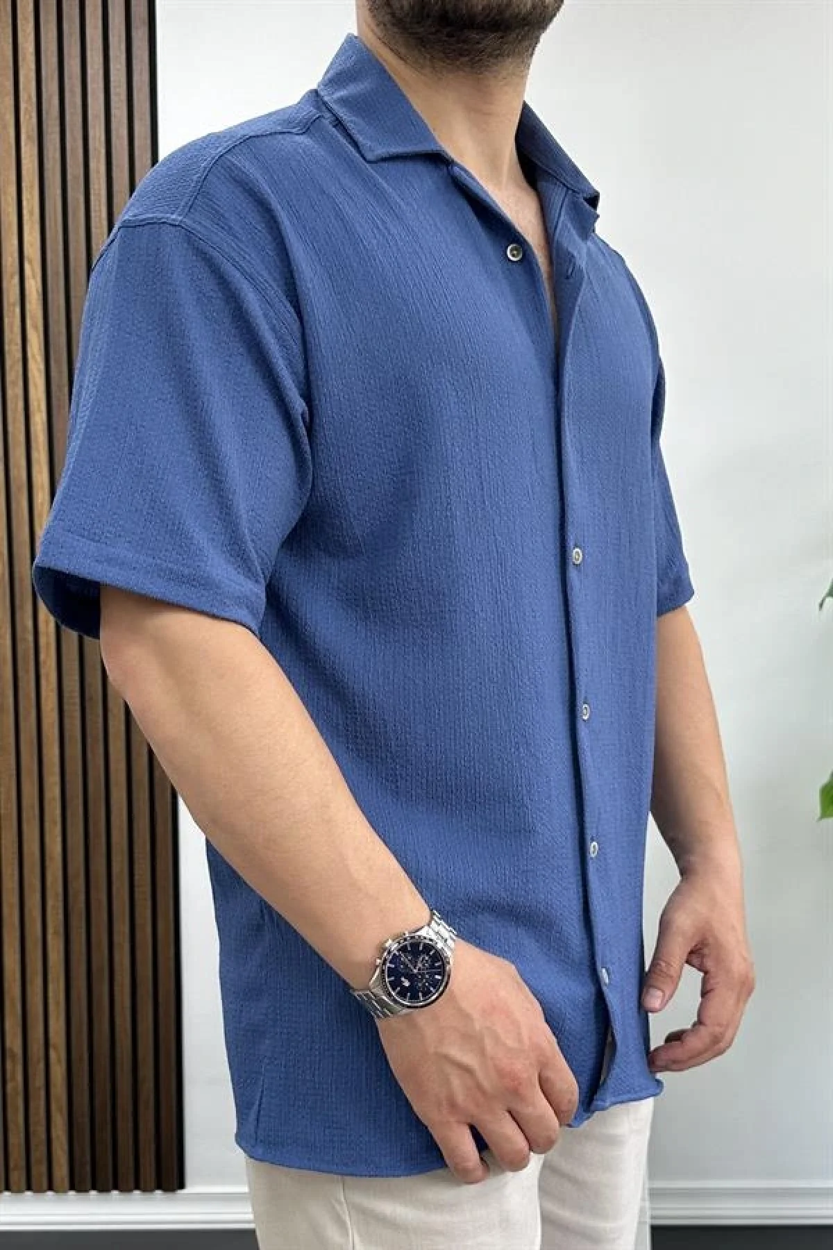 Erkek Gofre Kumaş Kısa Kollu Gömlek Mavi Edw109