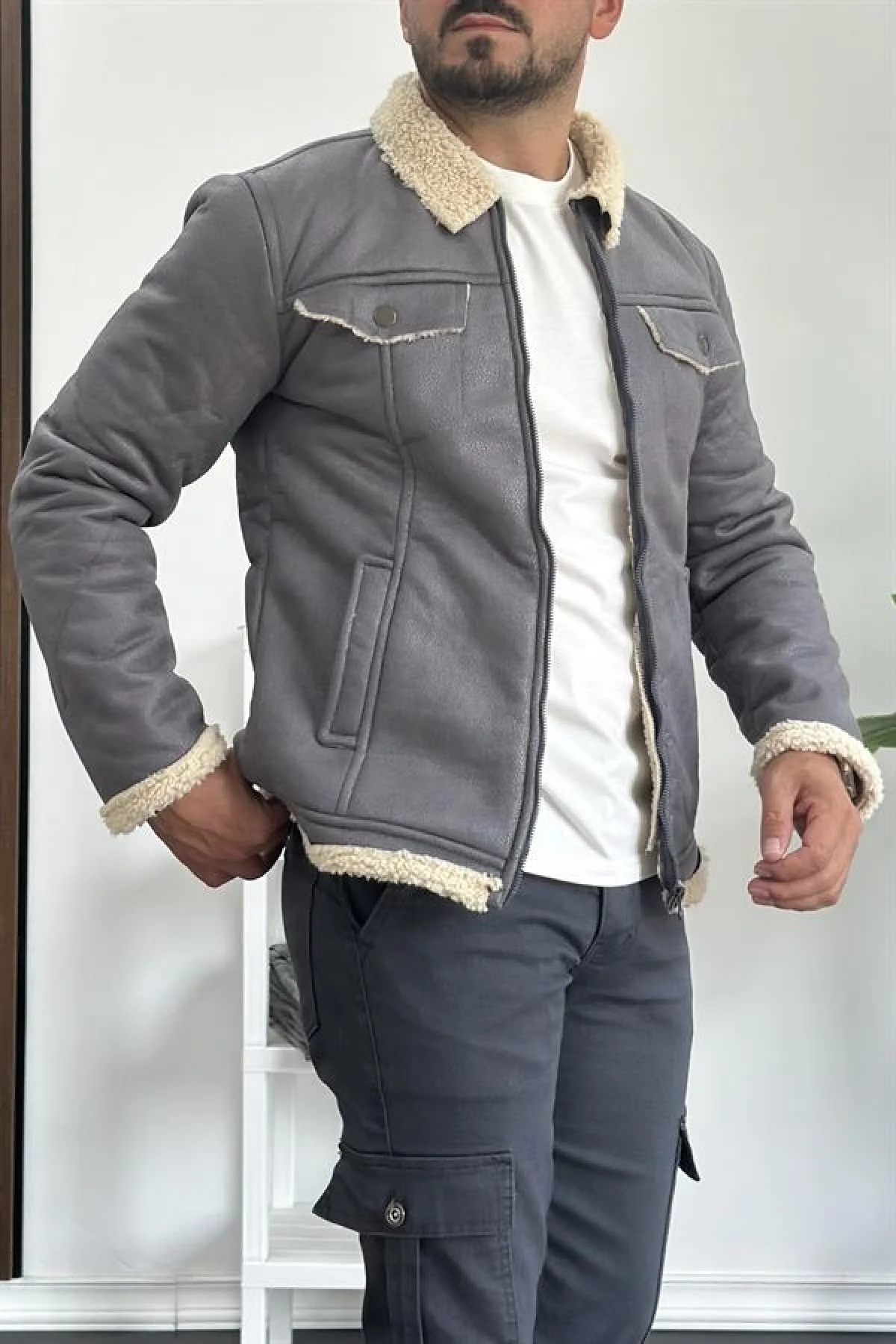 Erkek İçi Kürklü Suni Pul Deri Mont Gri Edw120