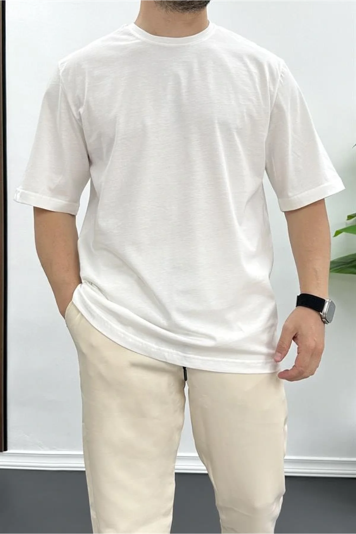 Erkek Oversize Pamuklu Basic T-shirt Ekru Edw089
