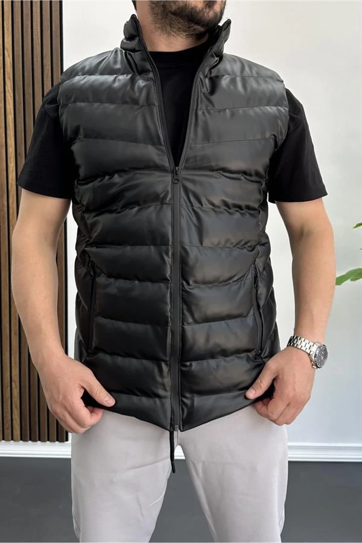 Erkek Slim Fit Fermuarlı Suni Deri Yelek Siyah Edw088