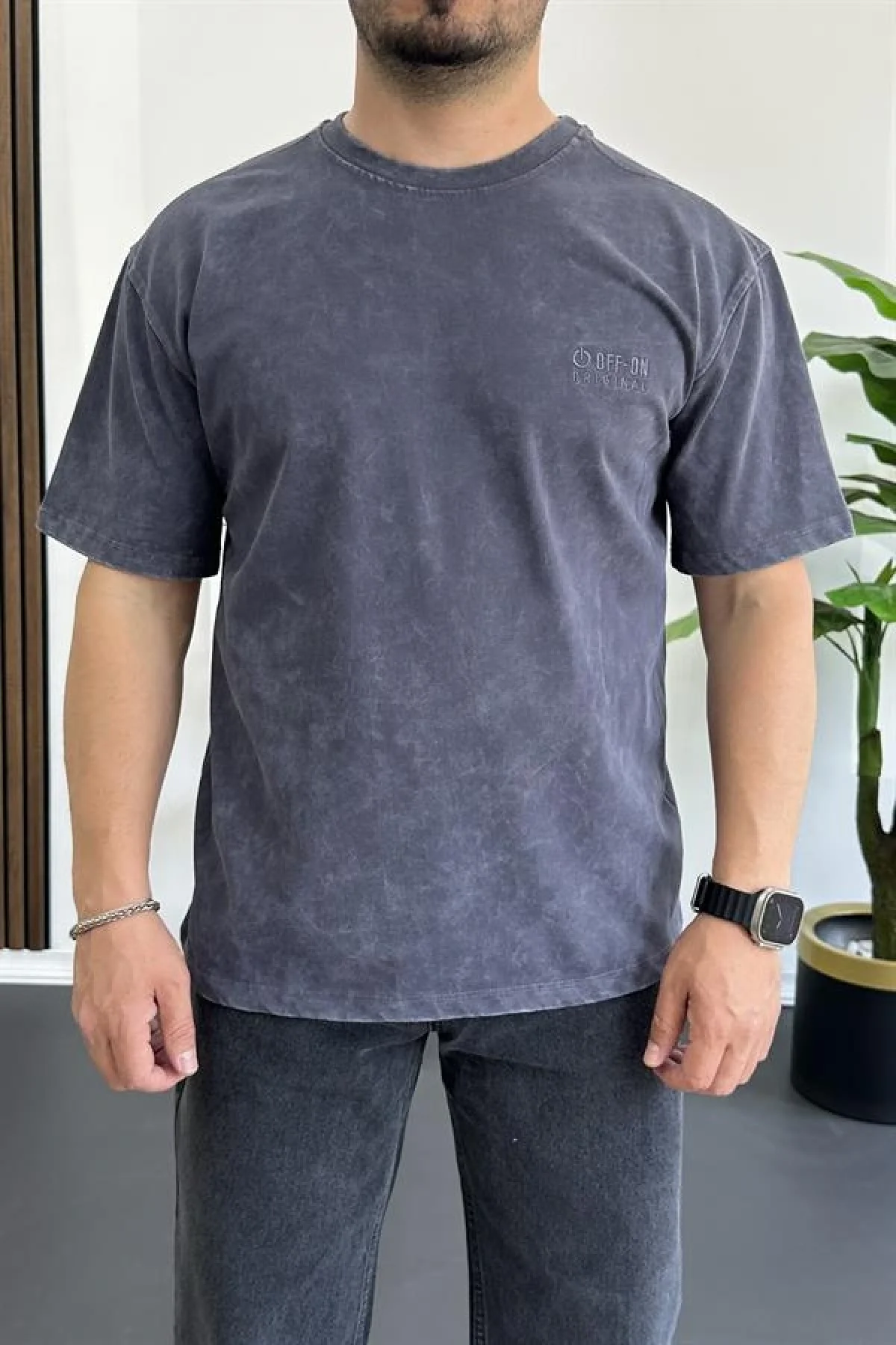 Erkek Oversize Geniş Kesim Yıkamalı Kumaş Nakış Logolu Tişört Füme Edw366