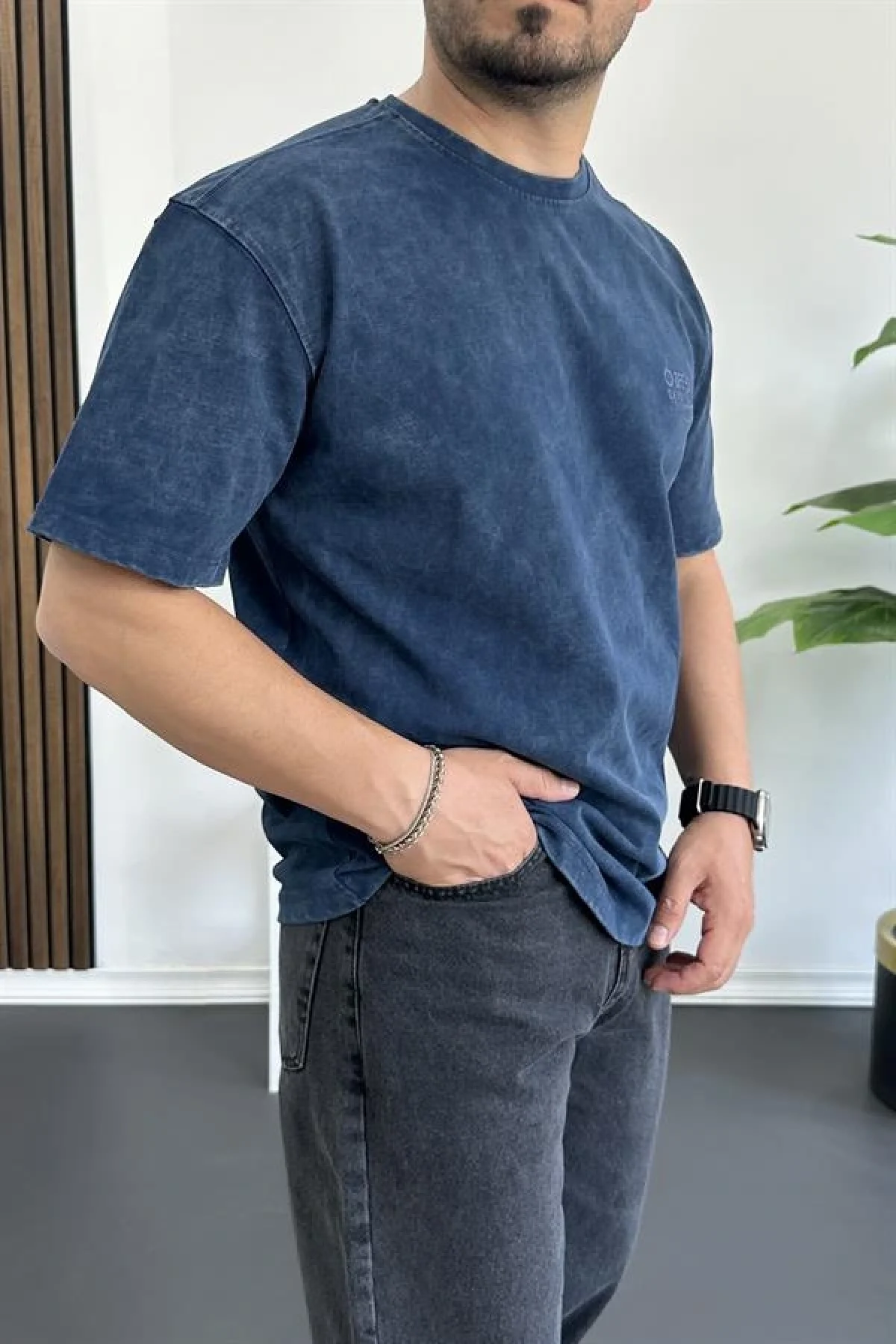 Erkek Oversize Geniş Kesim Yıkamalı Kumaş Nakış Logolu Tişört Mavi Edw366