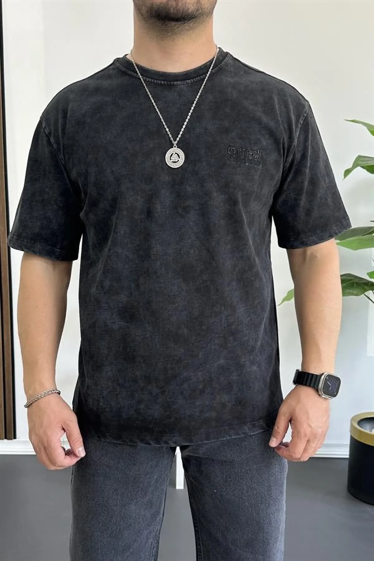 Erkek Oversize Geniş Kesim Yıkamalı Kumaş Nakış Logolu Tişört Siyah Edw366