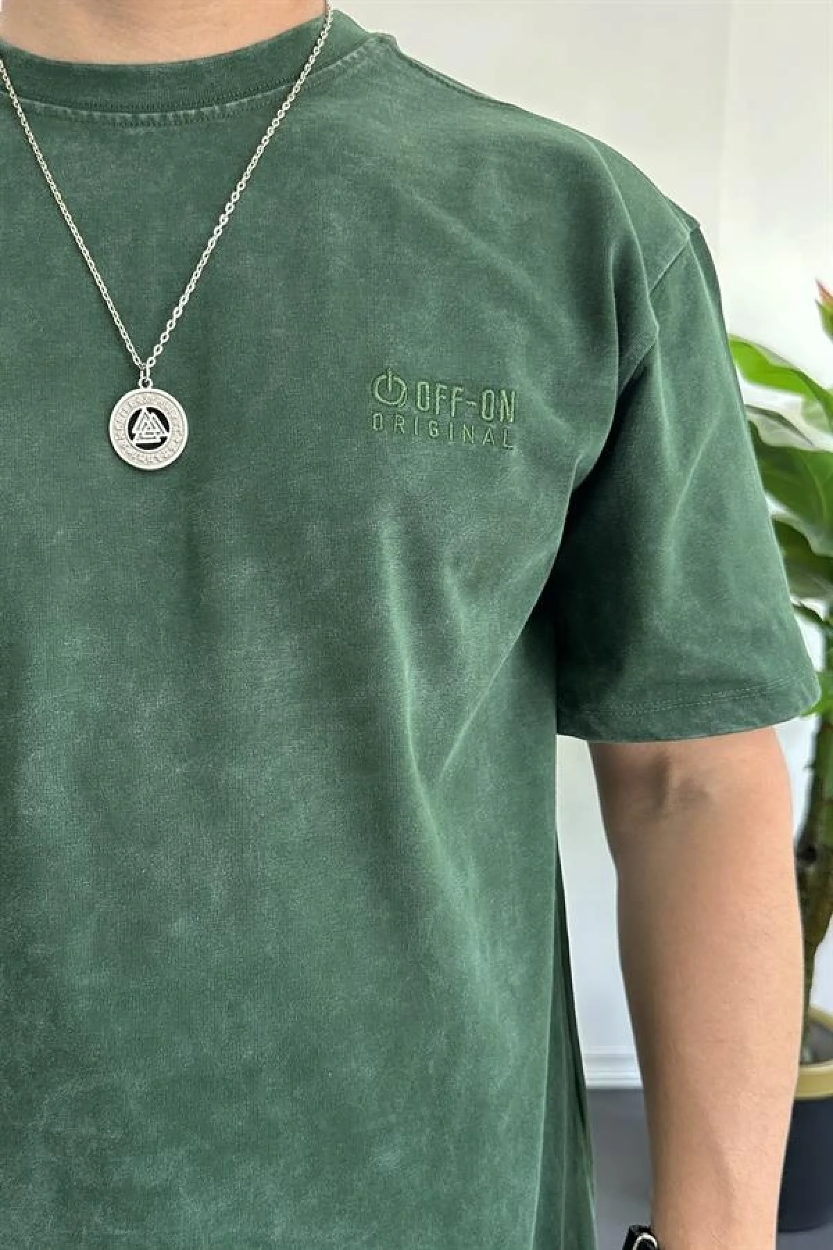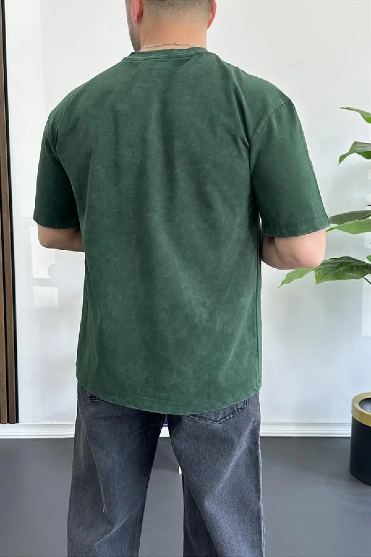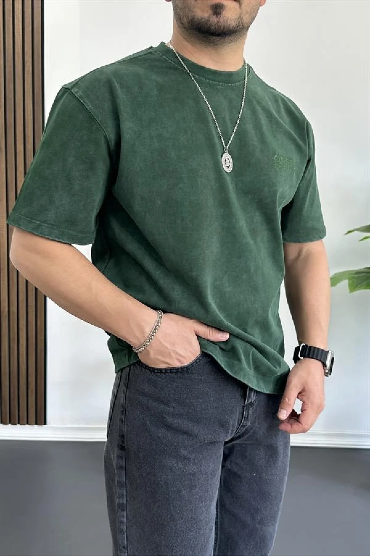 Erkek Oversize Geniş Kesim Yıkamalı Kumaş Nakış Logolu Tişört Yeşil Edw366