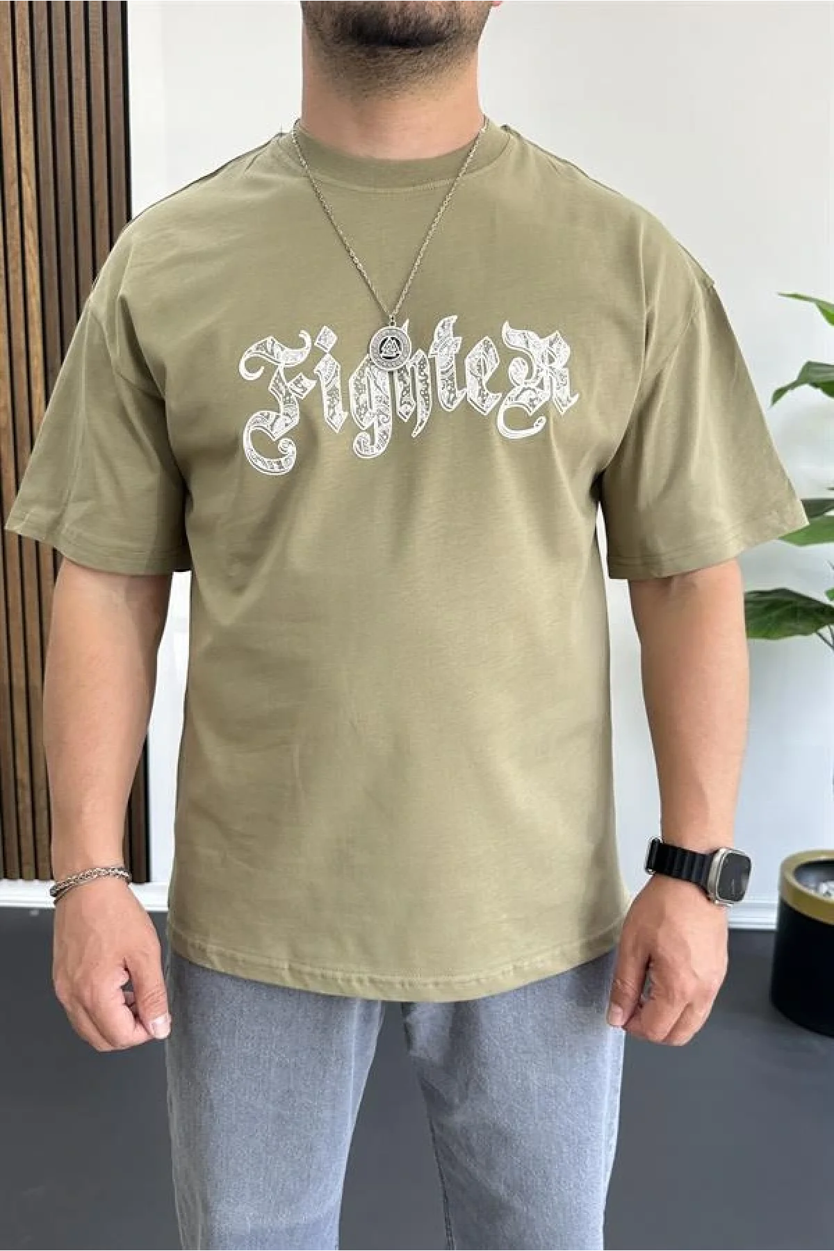 Erkek Oversize Ön ve Arka Kabartmalı Fighter Baskılı Tişört Yeşil Edw367