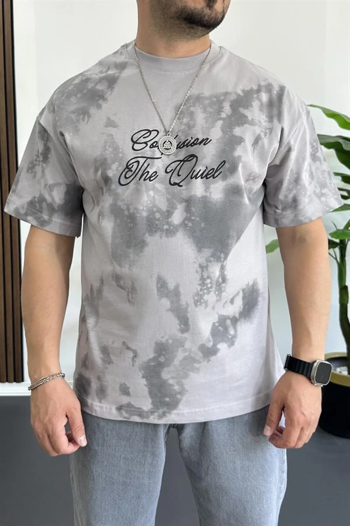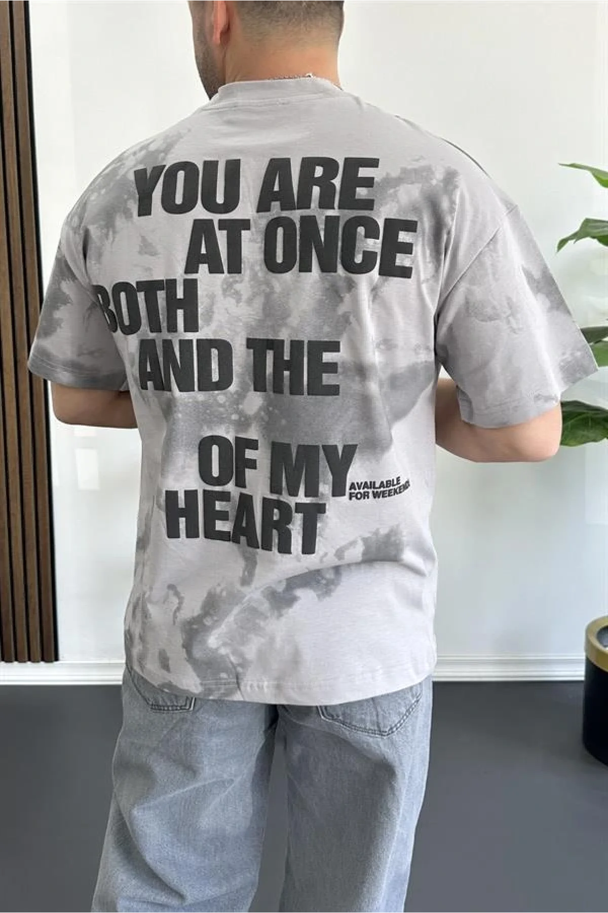 Erkek Oversize Ön ve Arka Kabartmalı Slogan Baskılı Tişört Gri Edw368