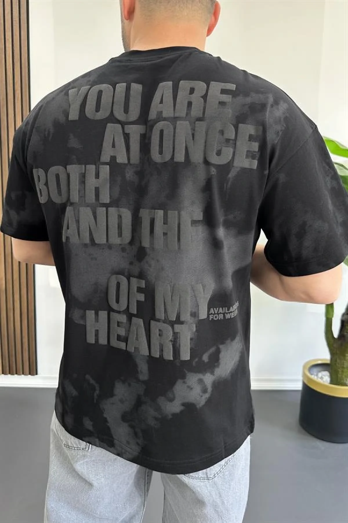 Erkek Oversize Ön ve Arka Kabartmalı Slogan Baskılı Tişört Siyah Edw368