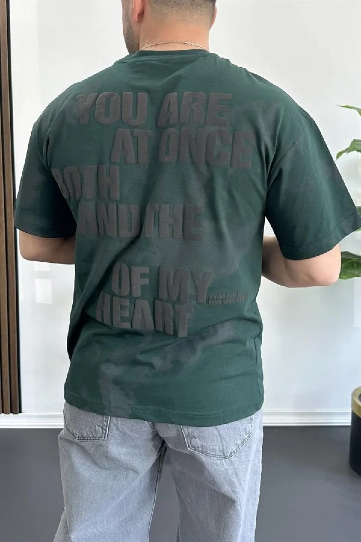 Erkek Oversize Ön ve Arka Kabartmalı Slogan Baskılı Tişört Yeşil Edw368
