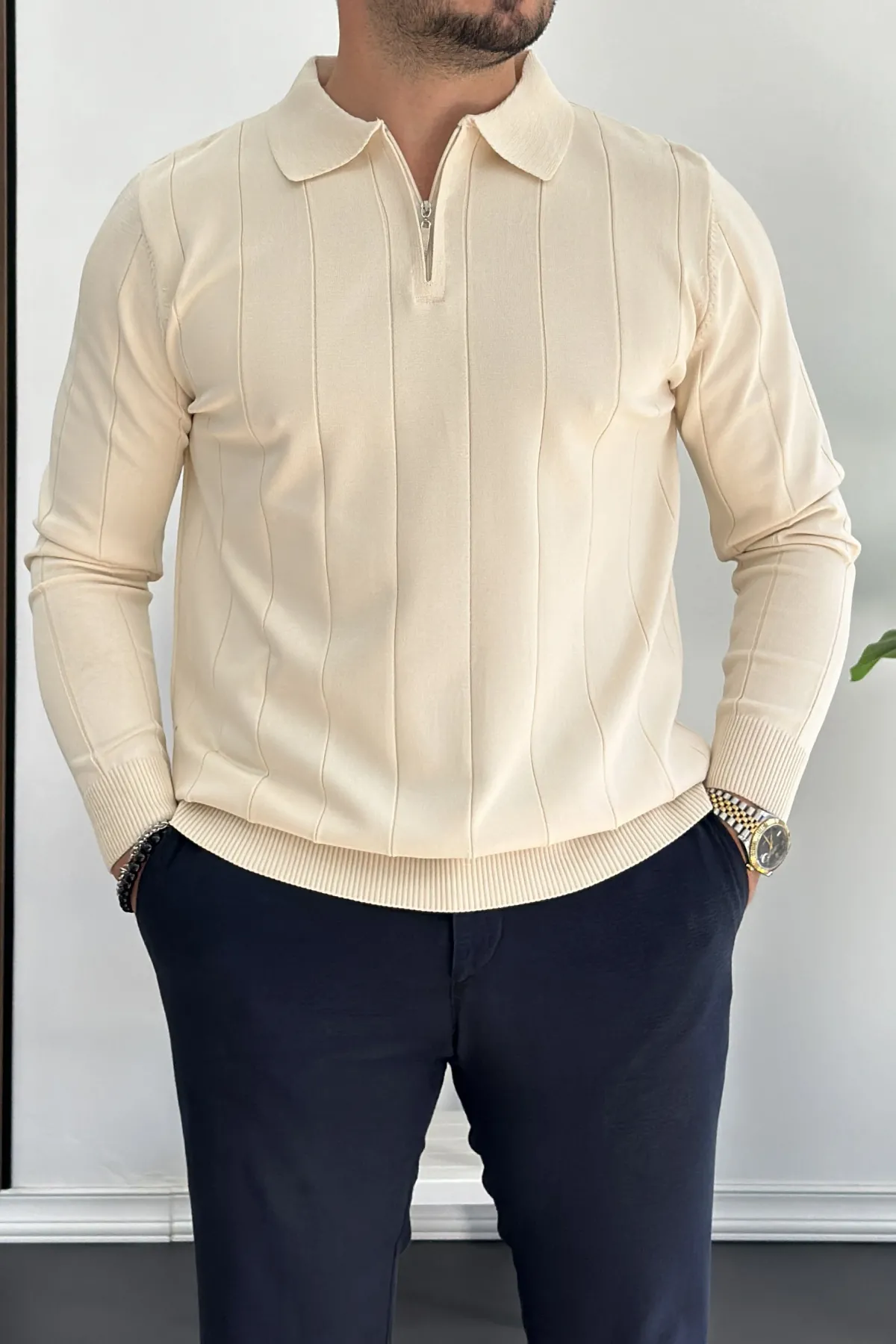 Erkek Yarım Fermuarlı Polo Yaka Mevsimlik Kazak Krem Edw195