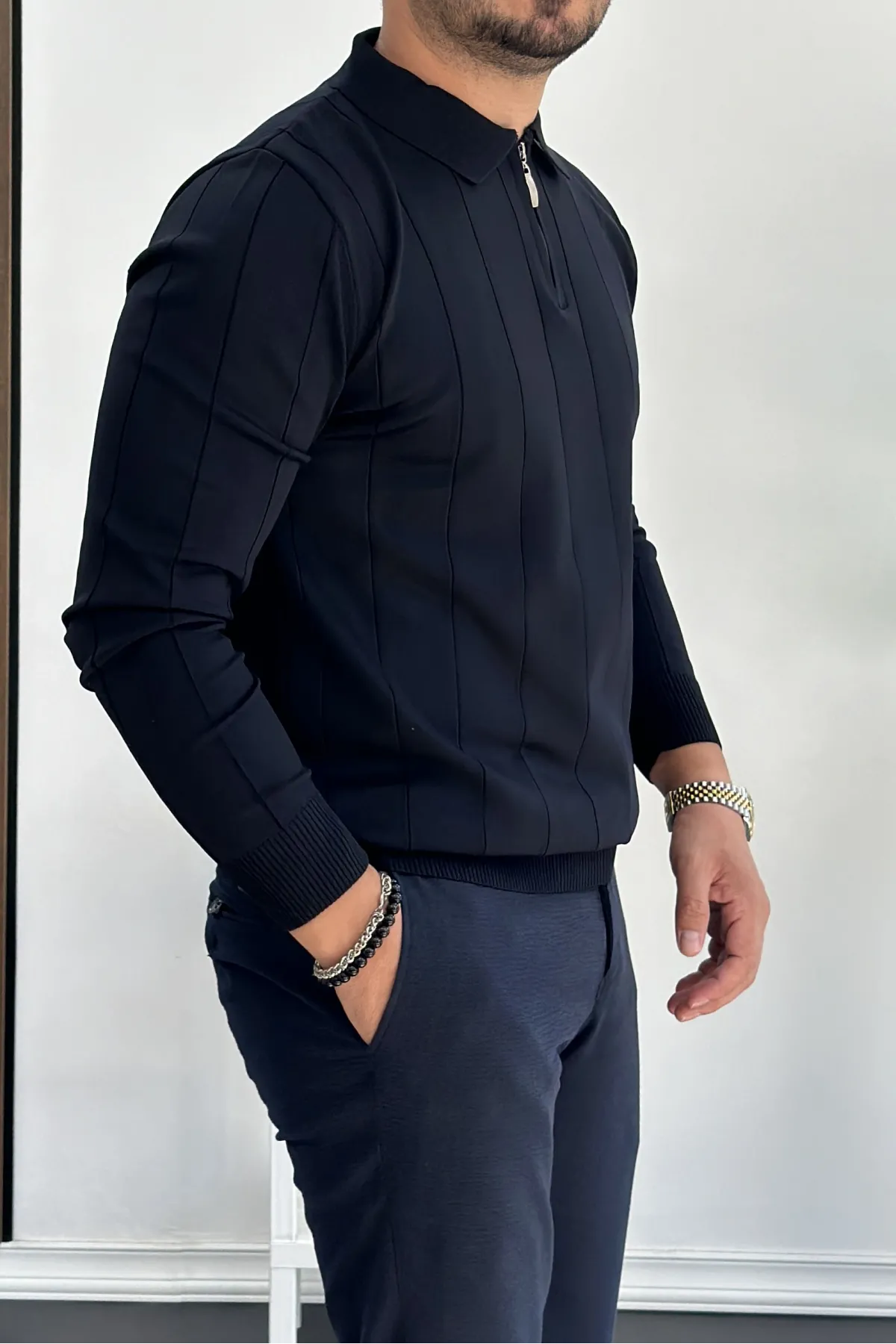 Erkek Yarım Fermuarlı Polo Yaka Mevsimlik Kazak Lacivert Edw195