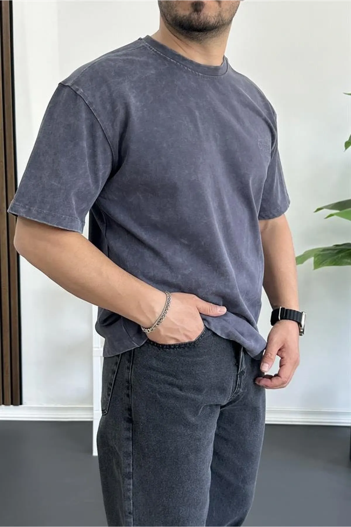 Erkek Oversize Geniş Kesim Yıkamalı Kumaş Nakış Logolu Tişört Füme Edw366