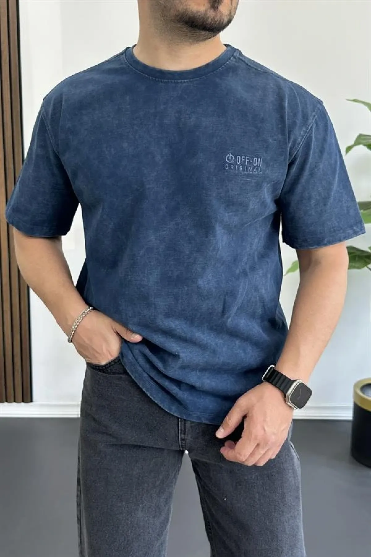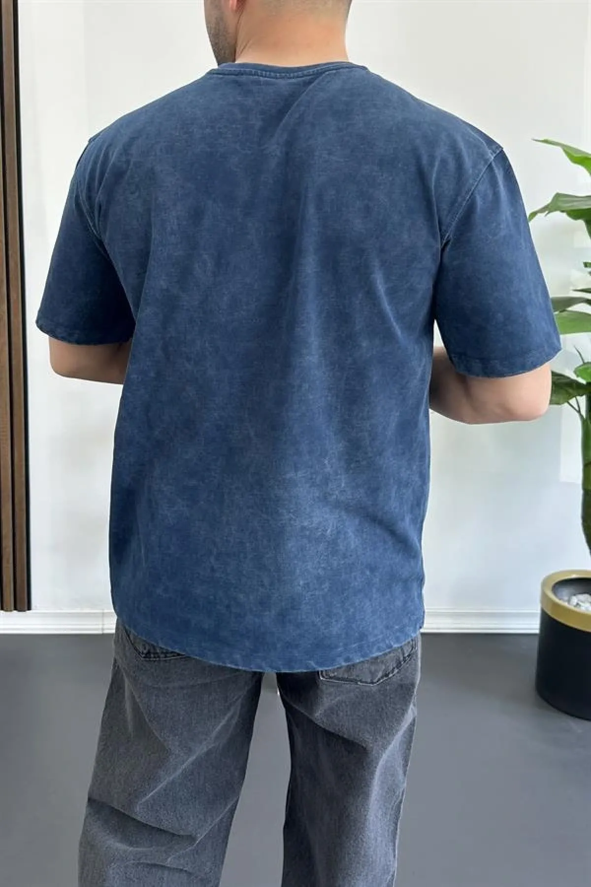 Erkek Oversize Geniş Kesim Yıkamalı Kumaş Nakış Logolu Tişört Mavi Edw366