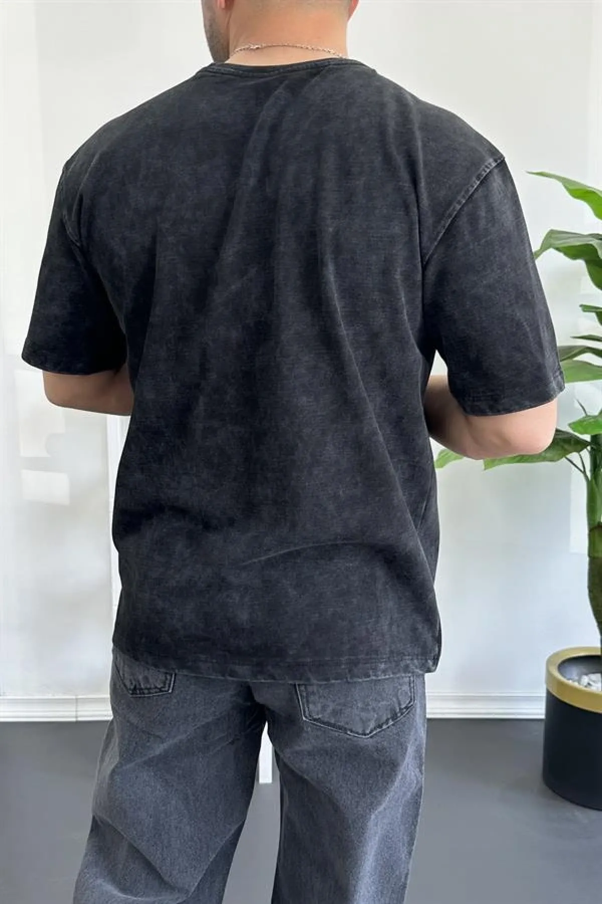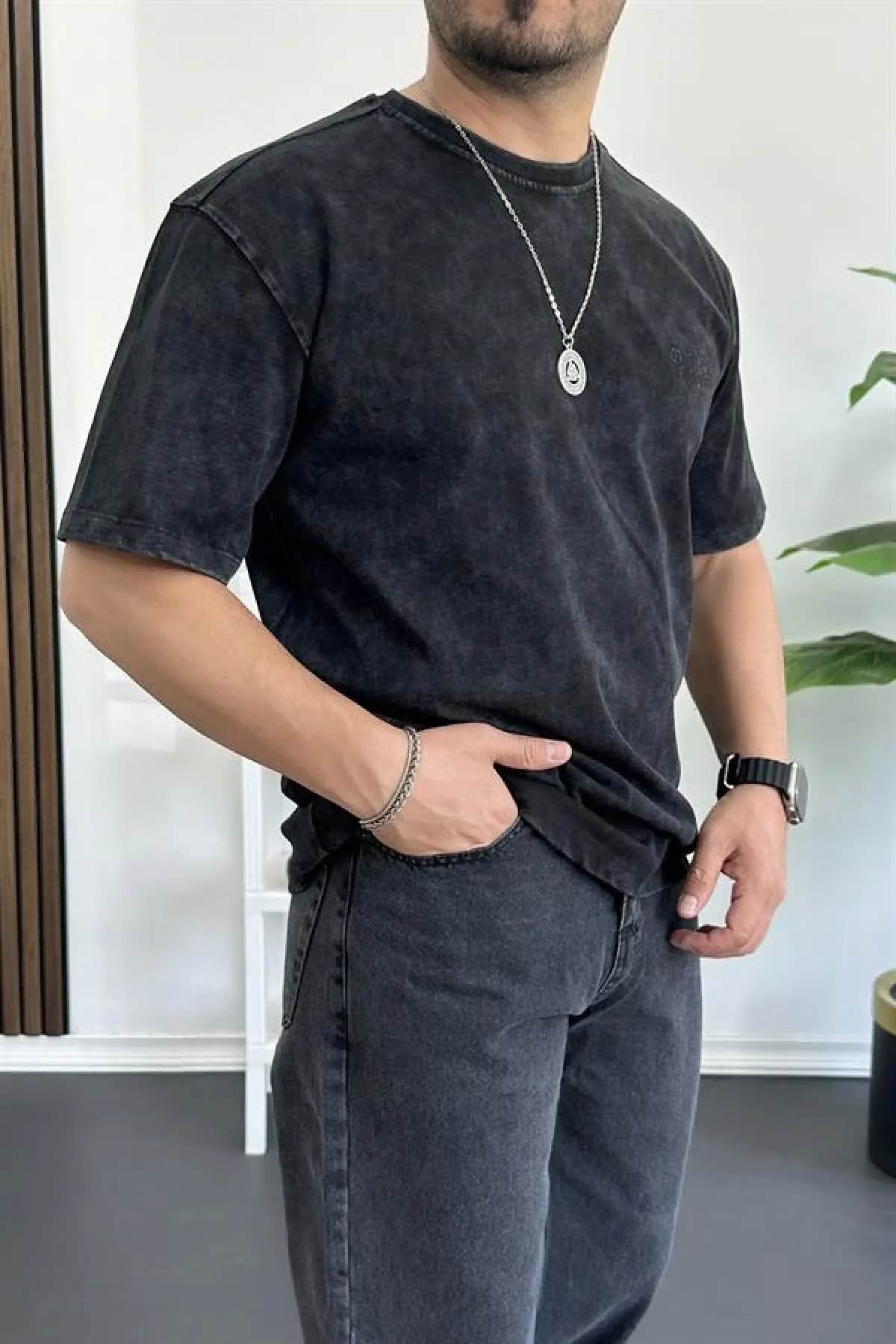 Erkek Oversize Geniş Kesim Yıkamalı Kumaş Nakış Logolu Tişört Siyah Edw366