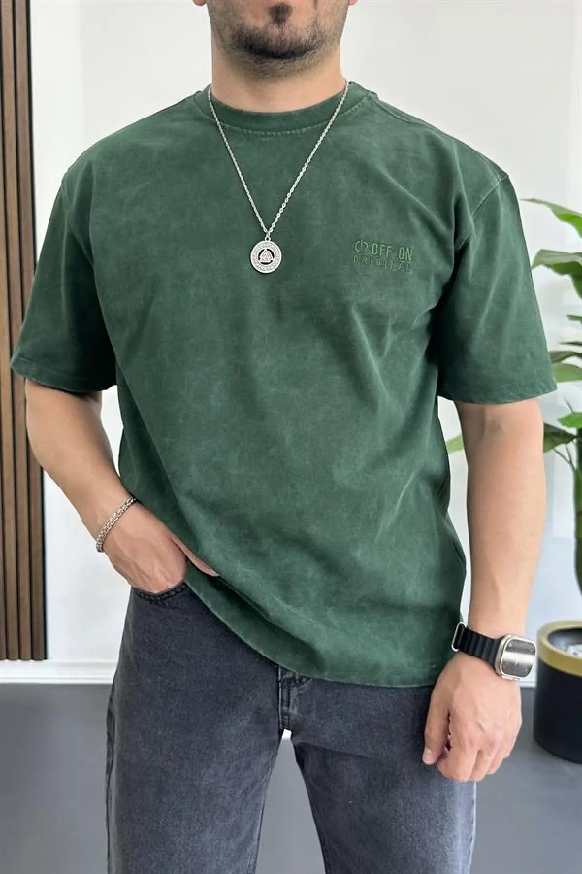 Erkek Oversize Geniş Kesim Yıkamalı Kumaş Nakış Logolu Tişört Yeşil Edw366