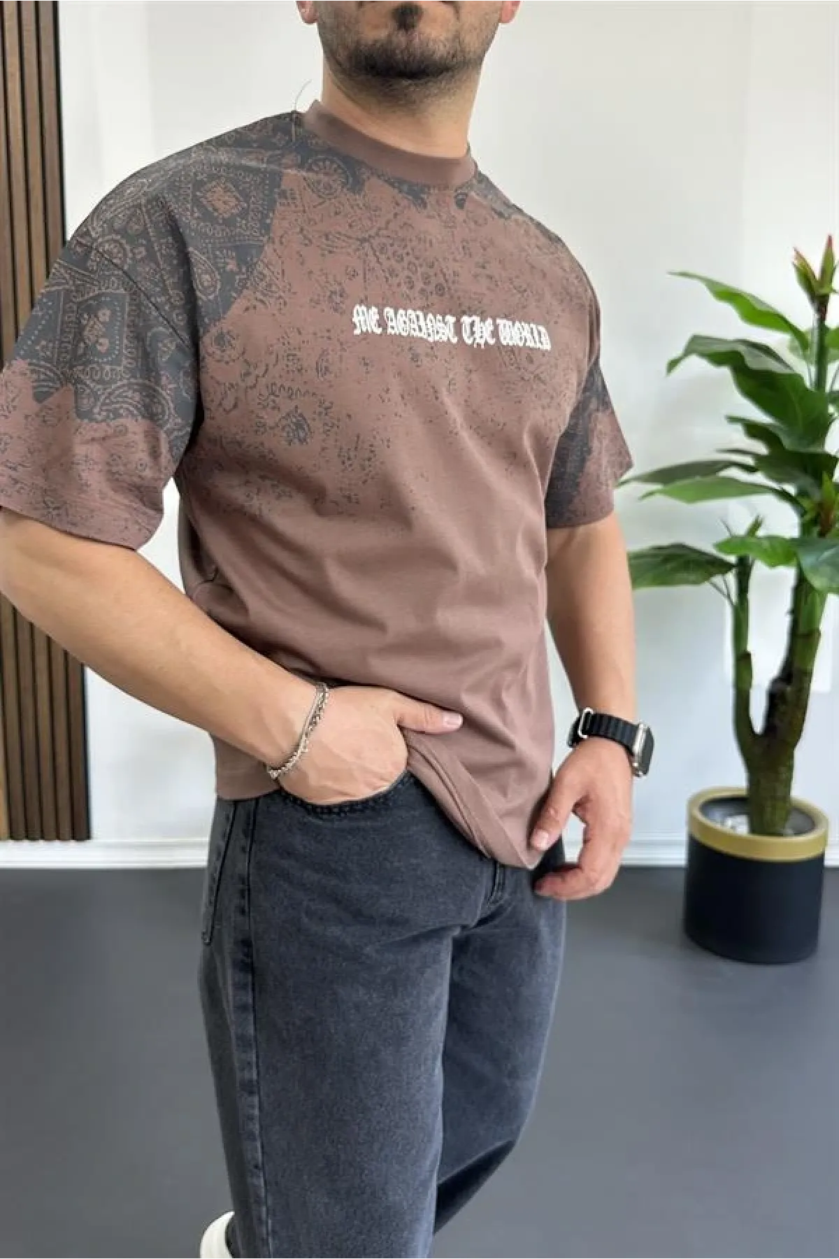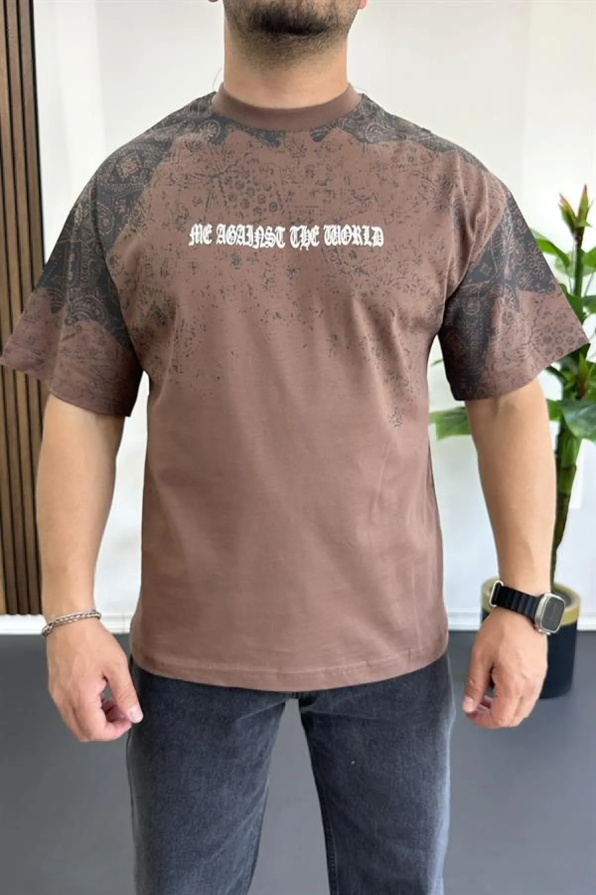 Erkek Oversize Ön ve arka baskılı Desenli Tişört Kahverengi Edw369