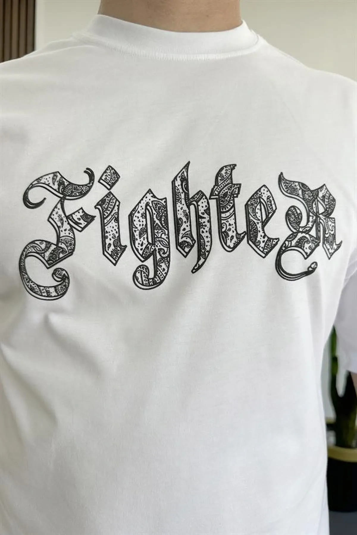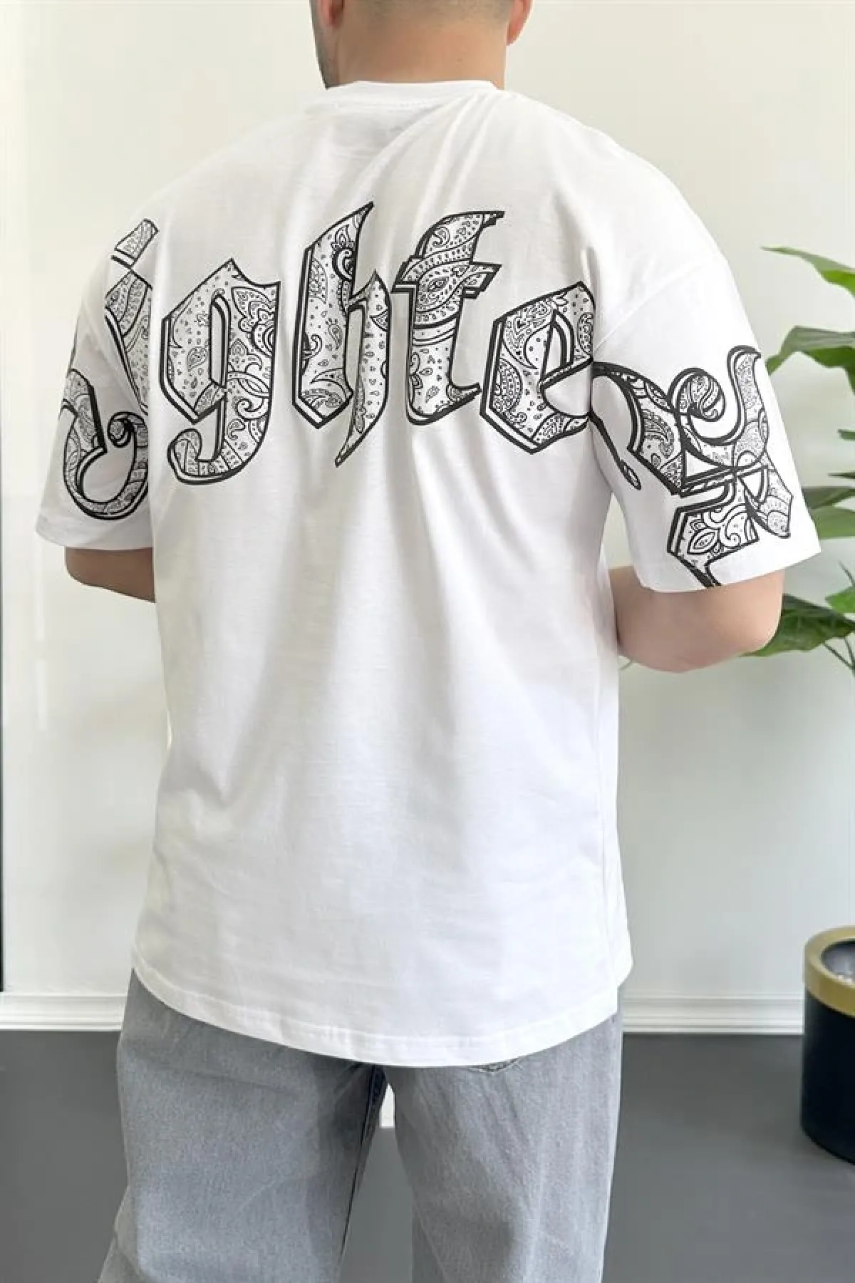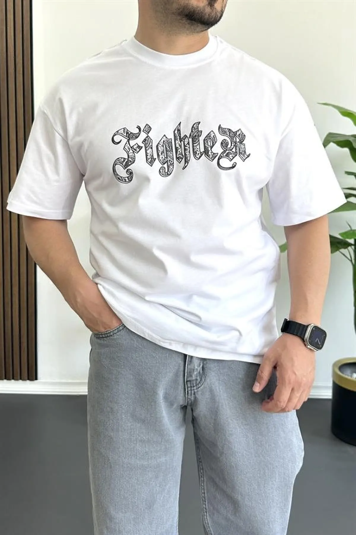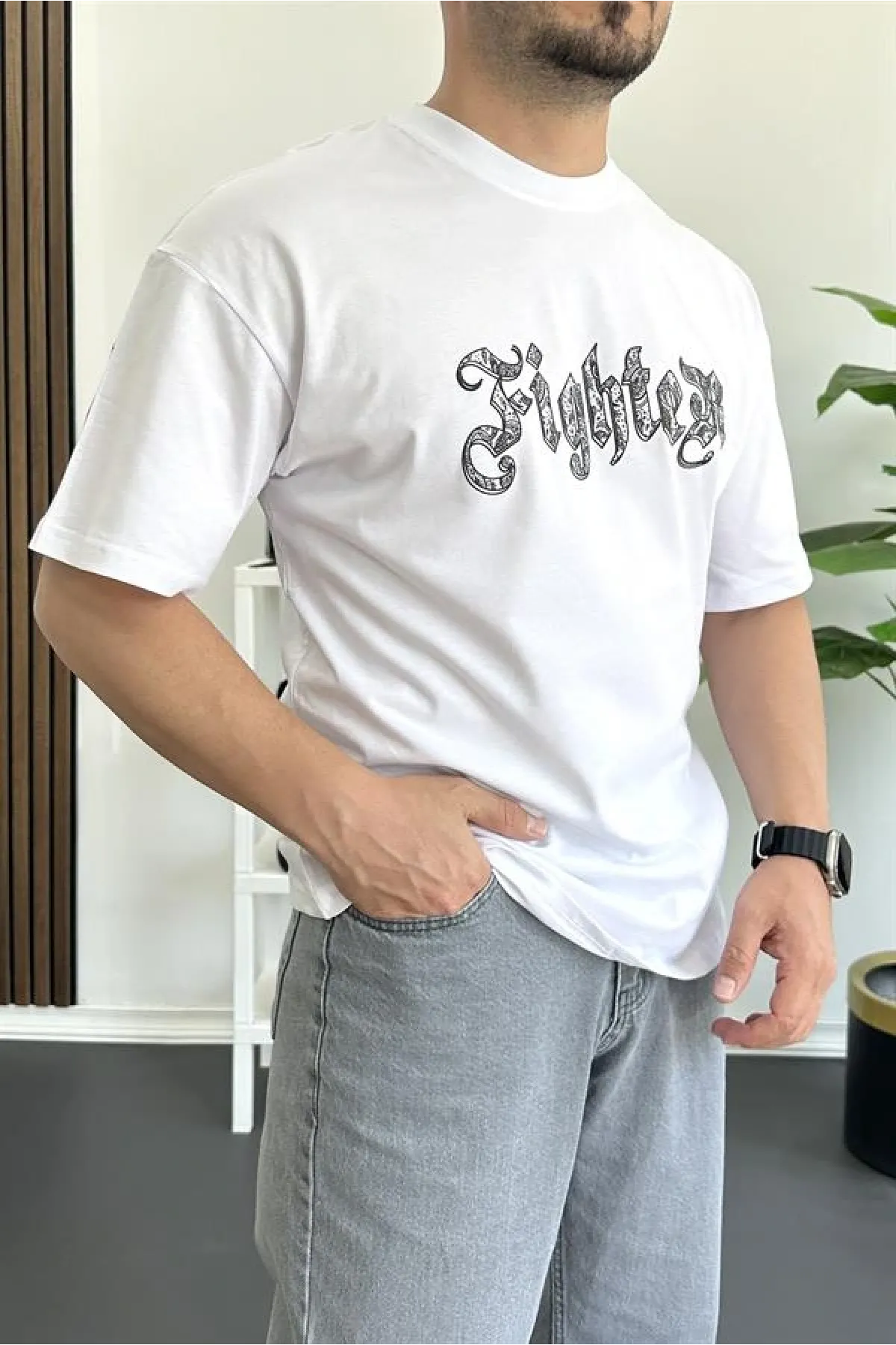 Erkek Oversize Ön ve Arka Kabartmalı Fighter Baskılı Tişört Beyaz Edw367