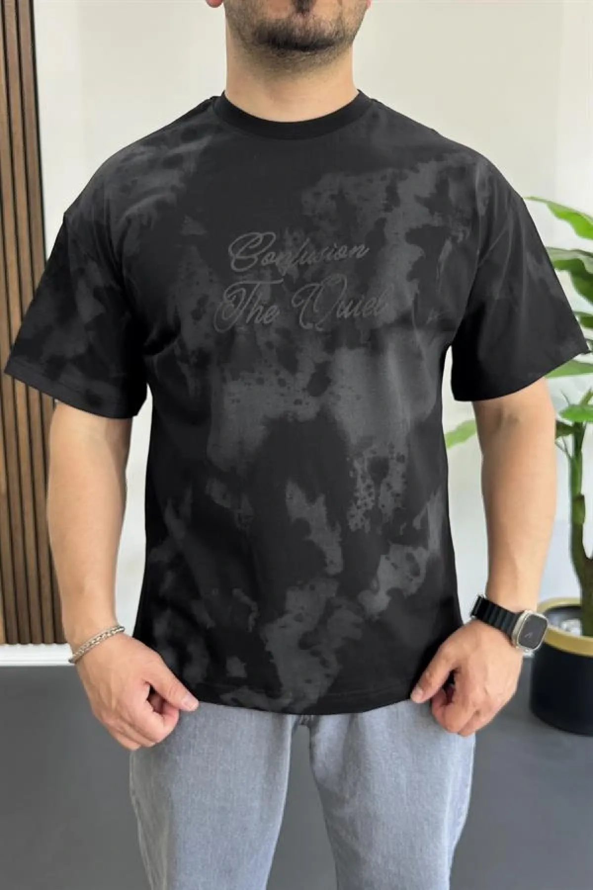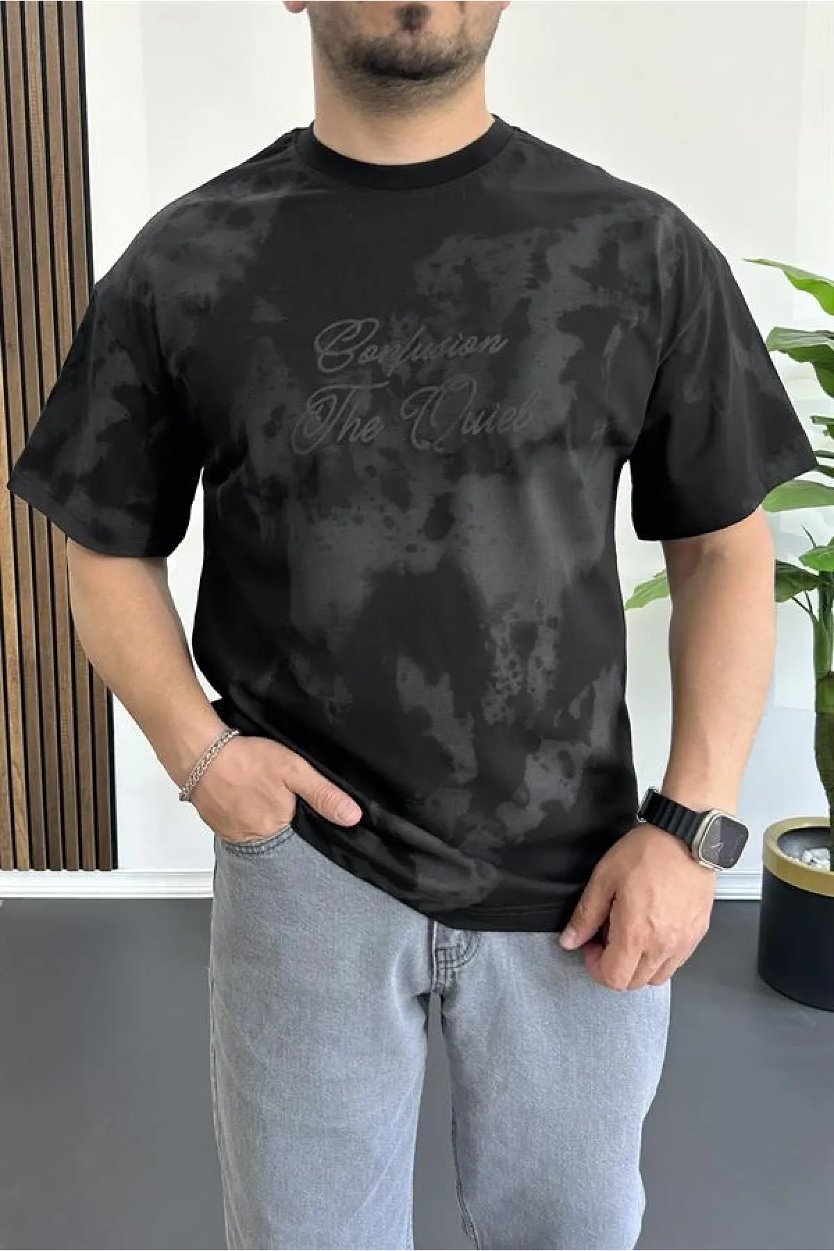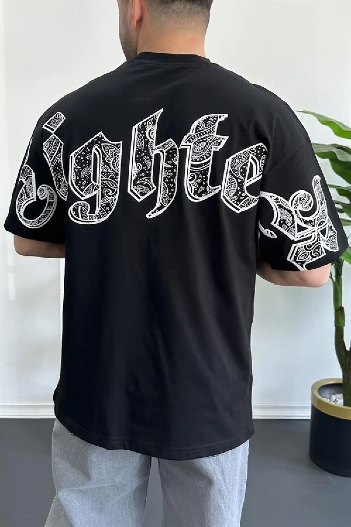 Erkek Oversize Ön ve Arka Kabartmalı Slogan Baskılı Tişört Siyah Edw368