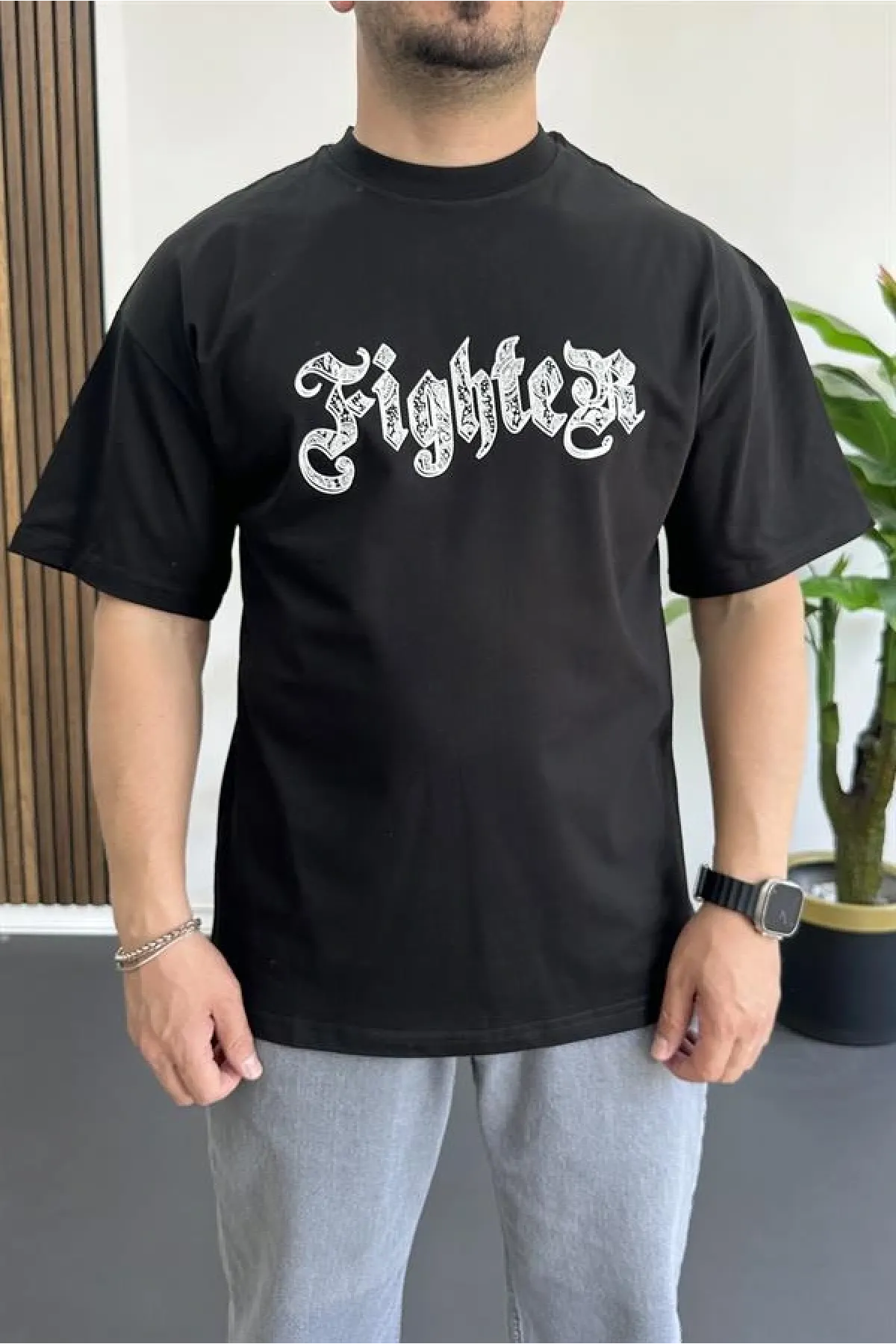 Erkek Oversize Ön ve Arka Kabartmalı Fighter Baskılı Tişört Siyah Edw367