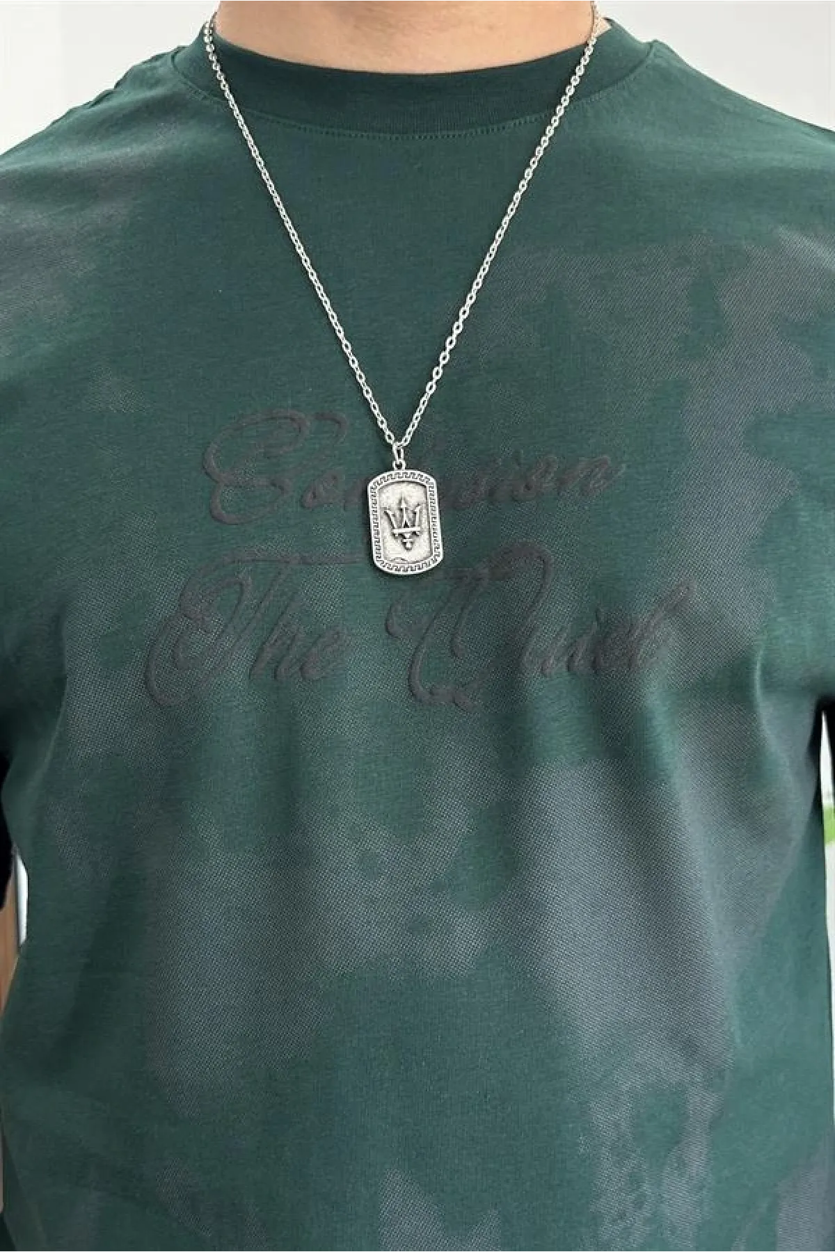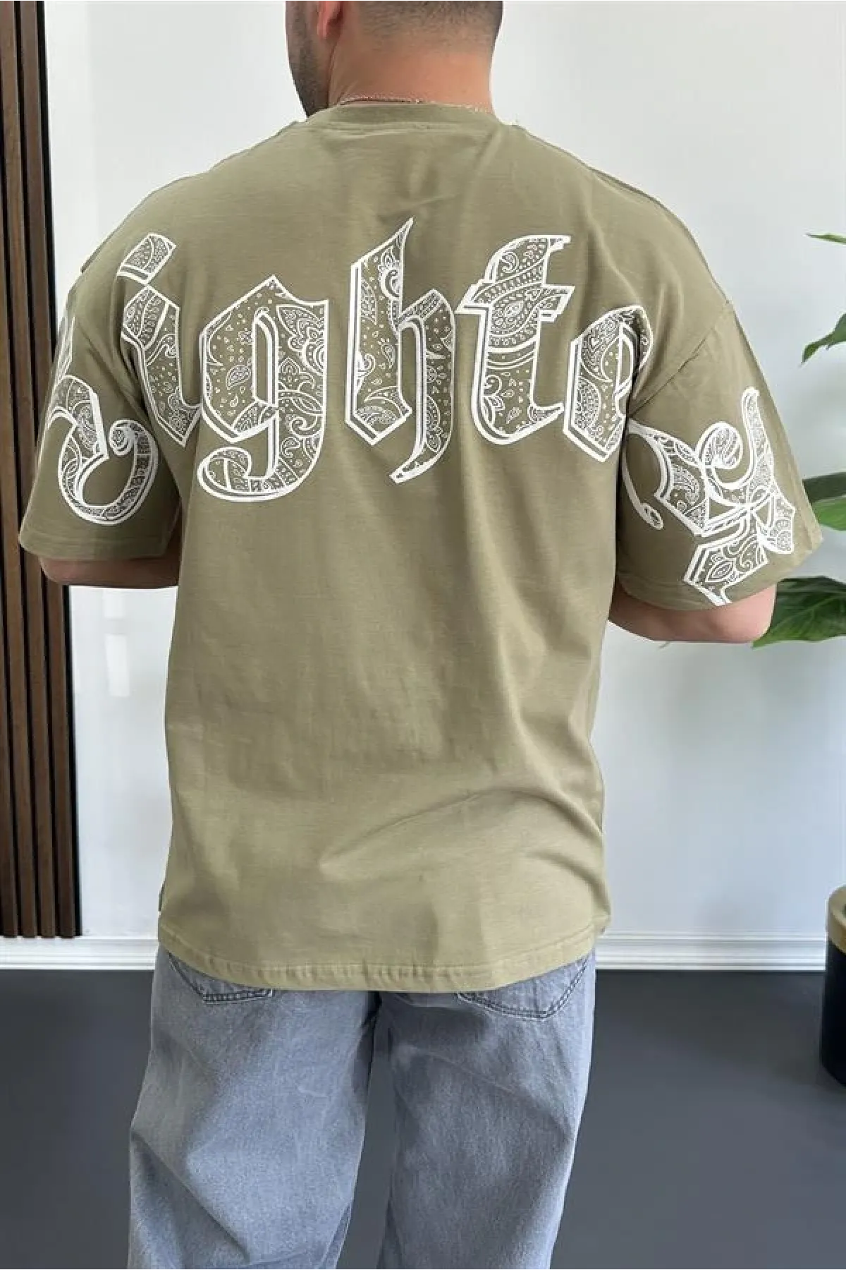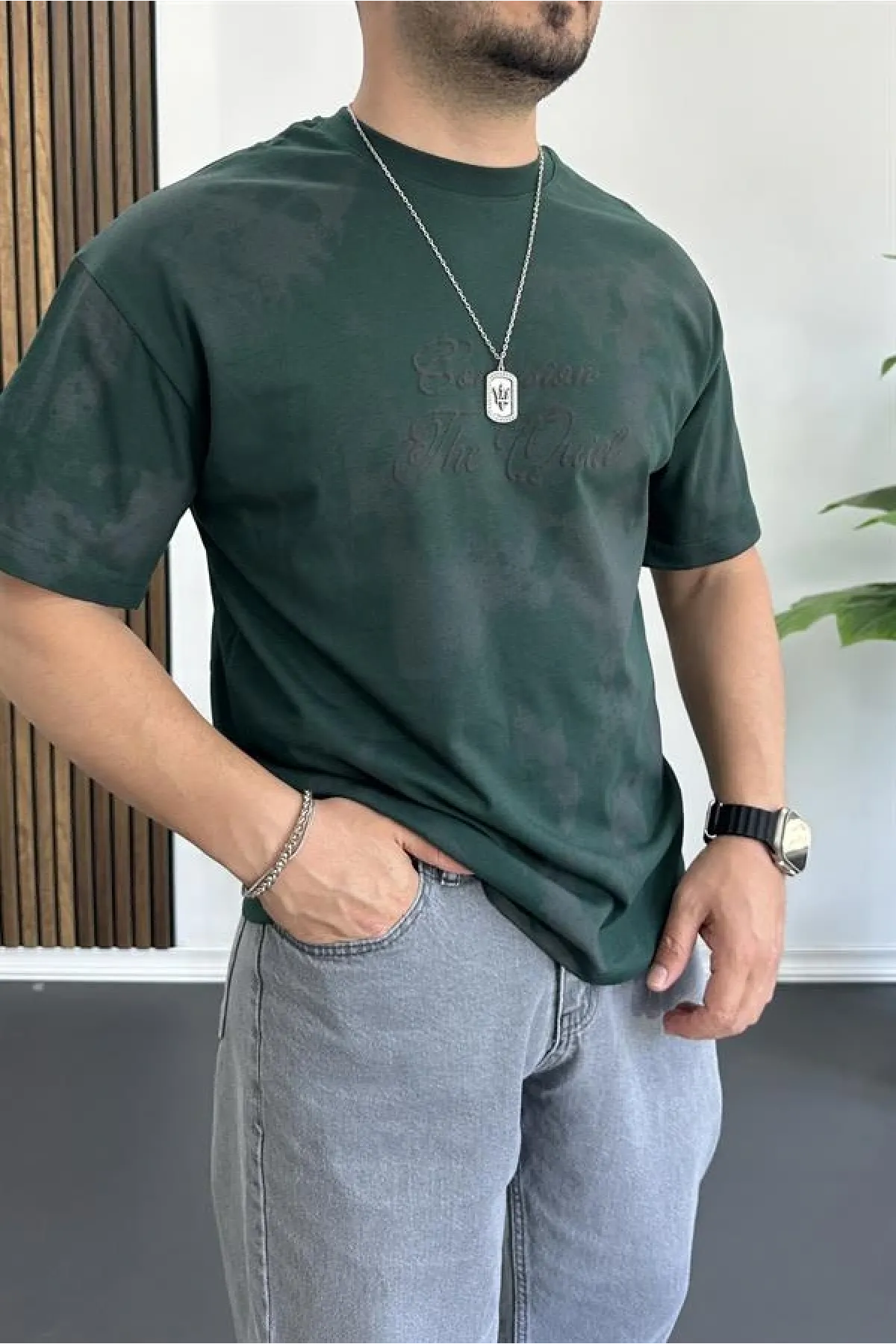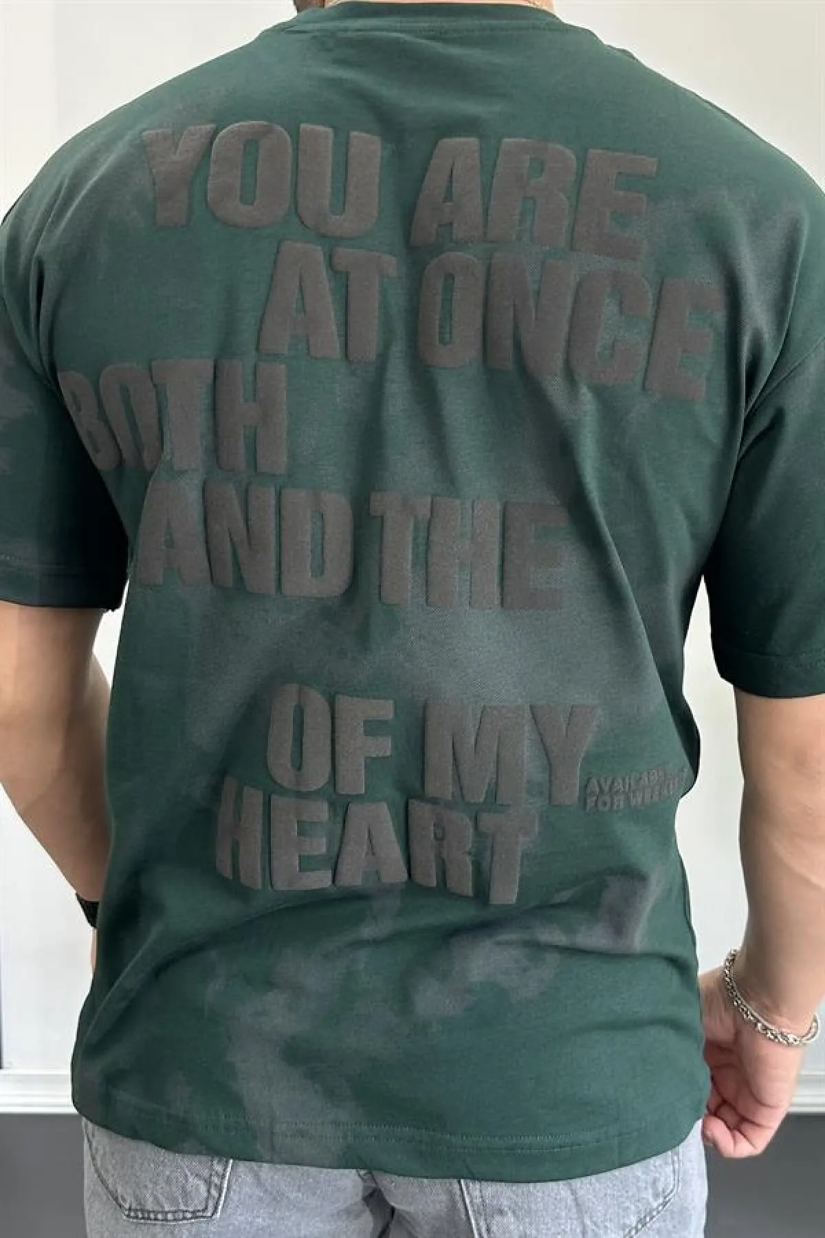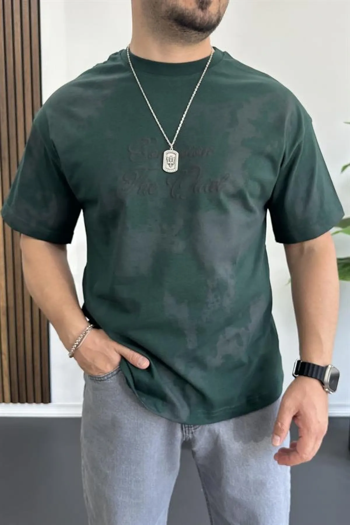 Erkek Oversize Ön ve Arka Kabartmalı Slogan Baskılı Tişört Yeşil Edw368