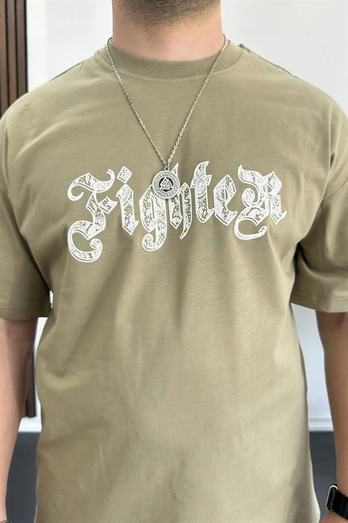 Erkek Oversize Ön ve Arka Kabartmalı Fighter Baskılı Tişört Yeşil Edw367