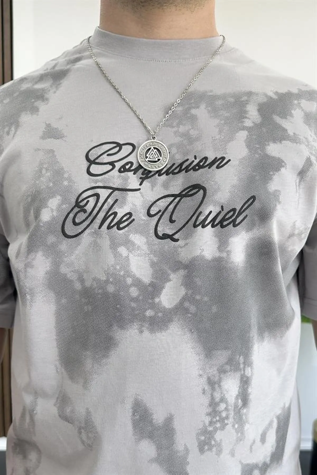 Erkek Oversize Ön ve Arka Kabartmalı Slogan Baskılı Tişört Gri Edw368